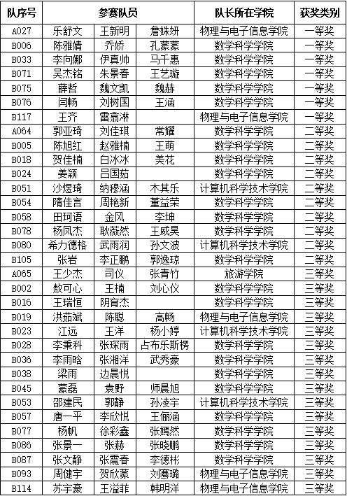 内蒙古师范大学第七届数学建模竞赛暨2024年全国大学生数学建模竞赛校级选拔赛于2024年6月22日举行。次比赛共有来自数学科学学院、物理与电子信息学院、计算机科学技术学院、地理科学学院、旅游学院、教育学院等六个学院共118支队伍参赛,组委会共收到论文110篇。经过组委会的认真评阅,共评出一等奖7组,二等奖10组,三等奖16组。具体名单如下: