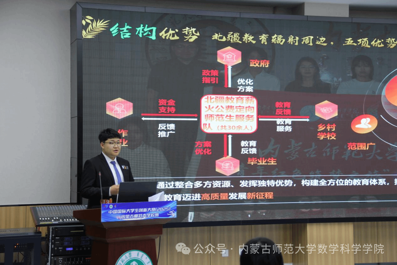 6月7日,以我院 2023 级数学与应用数学 4 班白昊杨为项目负责人与2024级数学与应用数学3班张妍茹、胡雅璇,2024级统计学班郭珈伊为团队成员的“北疆教育薪火公费定向师范生服务队”项目组在中国国际大学生创新大赛(2025)内蒙古师范大学校赛中脱颖而出,斩获校金奖荣誉。