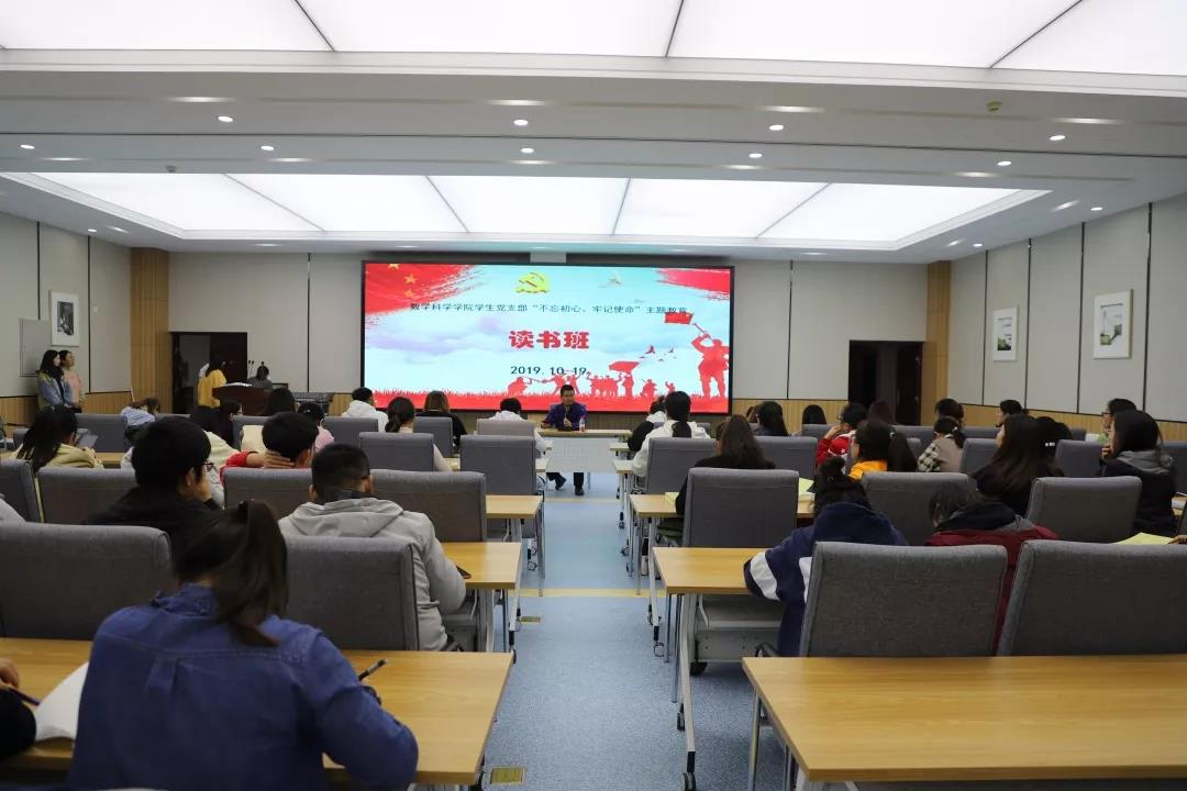 2019年10月19日,数学科学学院学生党支部于学生事务中心举办“不忘初心,牢记使命”主题教育读书班活动。数学科学学院数学与应用数学学生党支部书记皮建东带领各位学生党员、预备党员进行自主学习并进行学习心得交流。通过主题教育,读原著、学原文、悟原理,深切感受习近平总书记系列重要讲话精神,用新担当、新作为践行初心和使命。