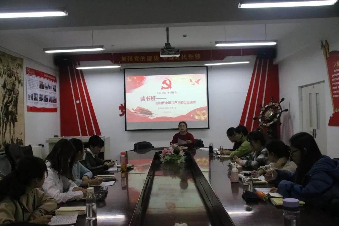 2019年11月26日,数学科学学院学生党支部于学院楼会议室举办“不忘初心、牢记使命”主题教育读书班活动。数学科学学院信息与计算科学学生党支部书记李帅带领各位学生党员、预备党员学习《习近平新时代中国特色社会主义思想学习纲要》一书。大家就中国共产党的历史使命展开讨论,并进行深入交流,进一步加深对习近平新时代中国特色社会主义思想的理解,真切认识到新时代中国共产党的历史使命。