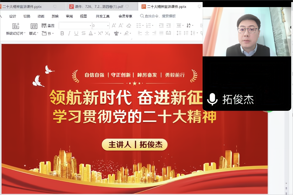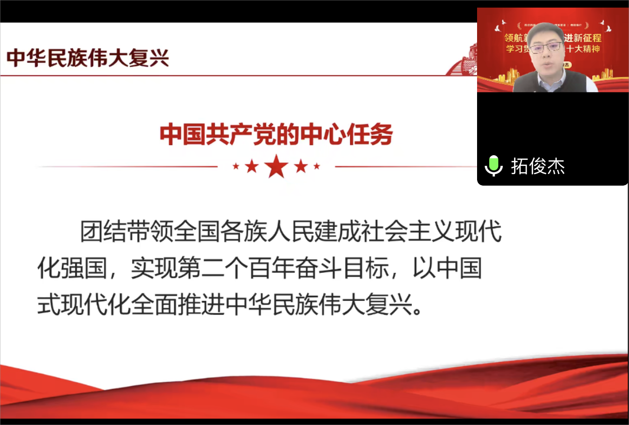 拓俊杰书记围绕深刻把握党的二十大的重要意义、深刻把握过去五年和新时代十年的伟大变革、深刻把握习近平新时代中国特色社会主义思想、深刻把握中国式现代化的中国特色和本质要求、深刻把握全面建设社会主义现代化国家的目标任务以及深刻把握以伟大自我革命引领伟大社会革命的重要要求等方面深入解读了党的二十大精神。拓俊杰书记的宣讲报告内容全面系统、重点突出,引导学员进一步深入领会党的二十大精神实质。数学科学学院教将继续深入学习贯彻党的二十大精神,确保党的二十大精神在学院落地生根,推动学院实际工作。