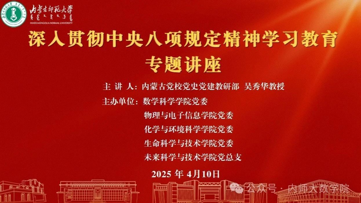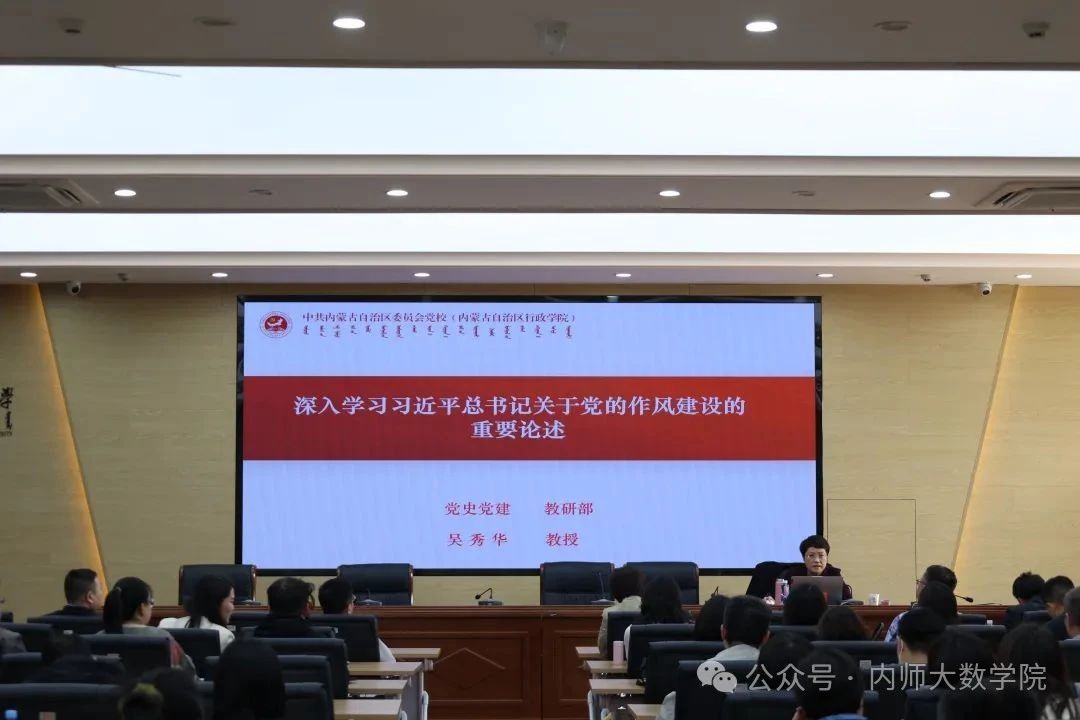 为深入贯彻落实党中央、自治区党委、学校党委深入贯彻中央八项规定精神学习教育精神和要求,高质量开展学习教育活动,4月10日,我院联合化学与环境科学学院、物理与电子信息学院、生命科学与技术学院和未来科学与技术学院在赛罕校区行政楼三楼报告厅举办深入贯彻中央八项规定精神学习教育读书班专题讲座。讲座邀请内蒙古党校党史党建教研部吴秀华教授作题为“深入学习习近平总书记华体会网页版党的作风建设的重要论述”专题讲座。
