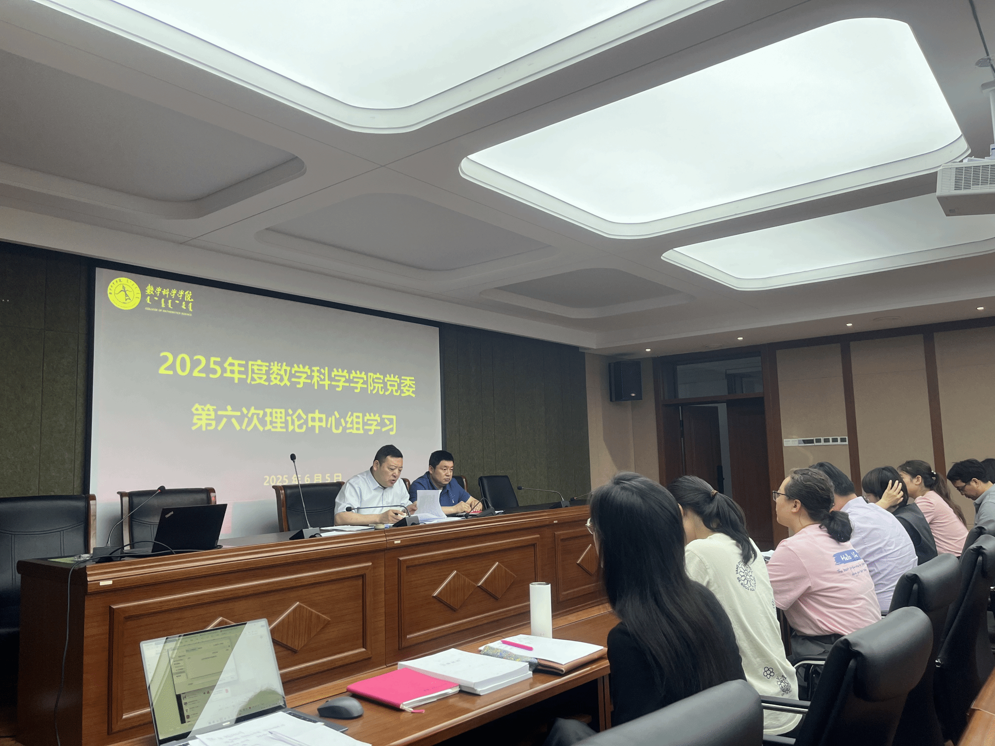 6月5日下午,数学科学学院党委理论学习中心组在赛罕校区文史楼一号会议室召开2025年度第六次集体学习会,学院党委书记张伟主持会议,学院领导、党委委员和各支部书记参会。