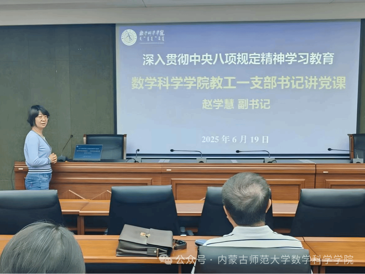 教工第二党支部副书记萨和雅结合学院实际讲授专题党课。党课剖析了教学、科研、管理等重点领域在日常工作中可能存在的廉政风险点,强调要加强监督,完善制度,防范“四风”问题反弹。要求全体党员增强自律意识,筑牢思想防线,坚决抵制不良风气,将作风建设融入人才培养全过程,培育兼具专业素养与高尚品格的新时代数学人才。