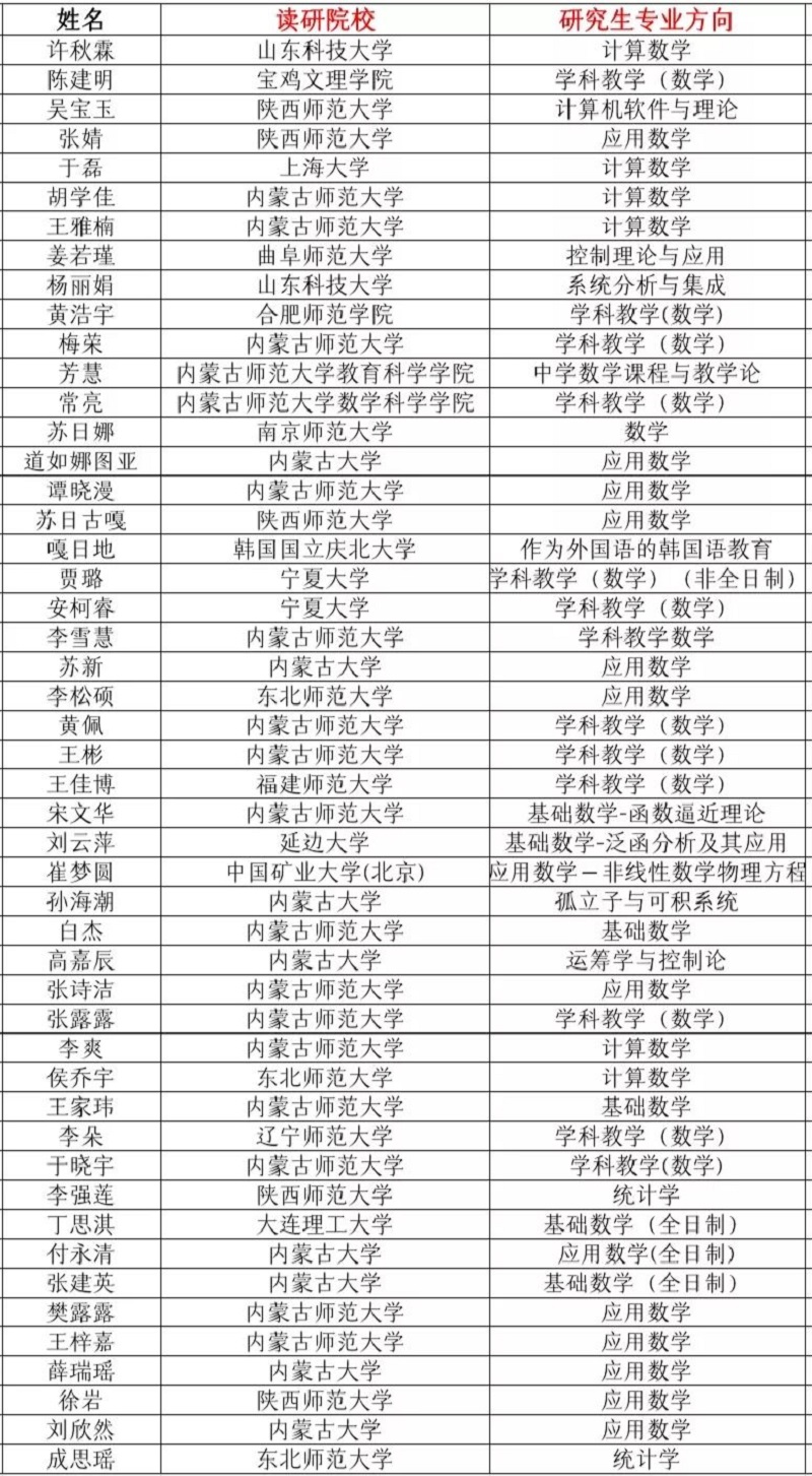 2019年,内蒙古师范大学数学科学学院考研人数再创新高。在2019年全国硕士研究生招生考试中我院共有49名同学被区内外各大高校录取,如东北师范大学、陕西师范大学、内蒙古大学等。 我们不知道考研对于你们到底意味这什么,但我们都清楚,在这段征途中,你们哭过、笑过、想过放弃,但你们最终依旧选择了坚持,并迎来坦荡前途! 因为“考研”二字,他们日日以“梦想”为闹钟,让努力每刻都是进行时,笔袋里一根根空掉的笔芯、图书馆里刻苦钻研的模样、清晨和深夜路灯下坚强的身影······他们没有辜负时间,也终得岁月回报。喜报传来,抬眸浅笑,胜者之姿! 2019年数学科学学院考取硕士研究生名单如下(共49名,排名不分先后):