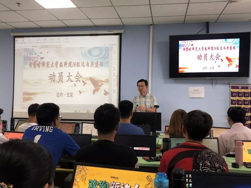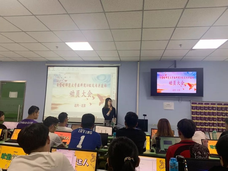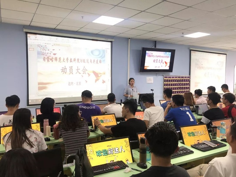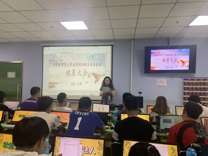 2019年9月4日下午,数学科学学院院长刘官厅教授、副院长包霞副教授、王桂霞教授因心系16级信息与计算科学大数据班学生,不辞辛劳到北京看望在北京学习的同学们,并在达内领导及驻校班主任王建新老师的陪同下出席内蒙古师范大学数科院16级信息与计算科学大数据班动员大会。