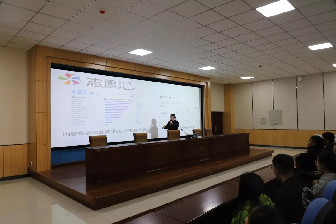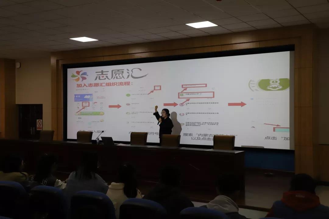 宣讲中冀永芳同学提到国家对志愿服务的重视,并向同学们介绍了“志愿汇”APP的注册流程及部分功能、2018年“志愿汇”相关统计数据、内蒙古师范大学志愿者服务总队开展的部分活动。