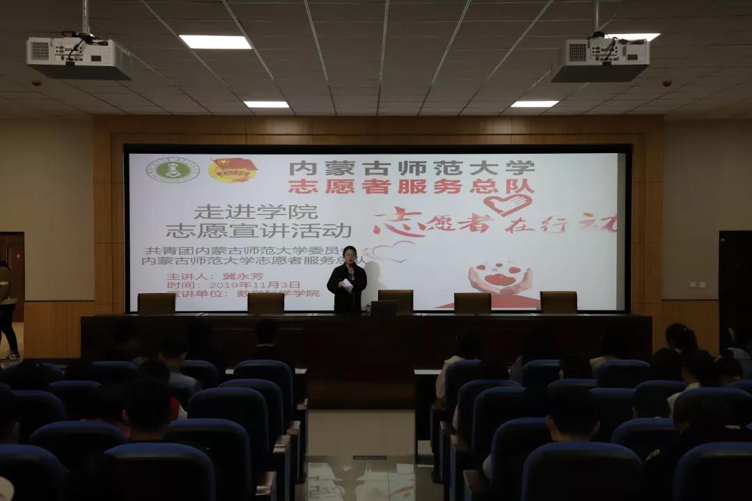 2019年11月3日,为使各位同学积极投入志愿服务活动,更好地了解“志愿汇”APP,内蒙古师范大学志愿者服务总队负责人冀永芳同学向数学科学学院各班班委及学生代表就志愿服务活动及“志愿汇”APP相关问题进行宣讲,此次志愿宣讲活动于学生事务中心一楼报告厅举行。