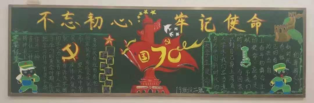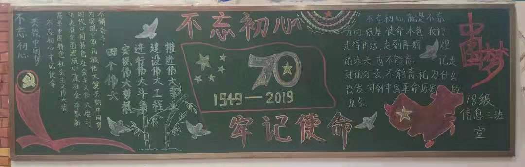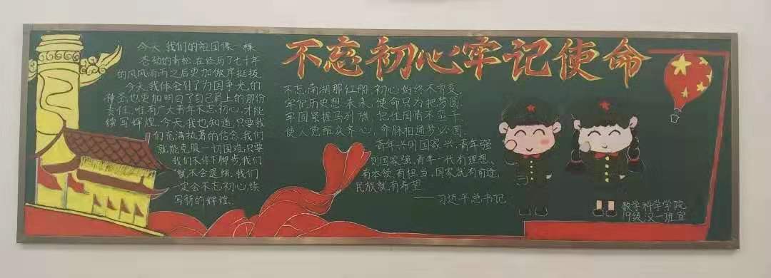 为扎实推进“不忘初心、牢记使命”主题教育,让广大学生坚定理想信念、进一步激发大家的爱国热情,激励同学们勇于作为、勇于担当,2019年11月数学科学学院开展板报评比大赛,学院18、19级各团支部积极参与,板报设计主题鲜明、内容丰富。