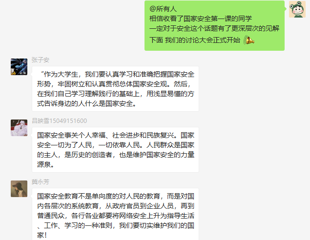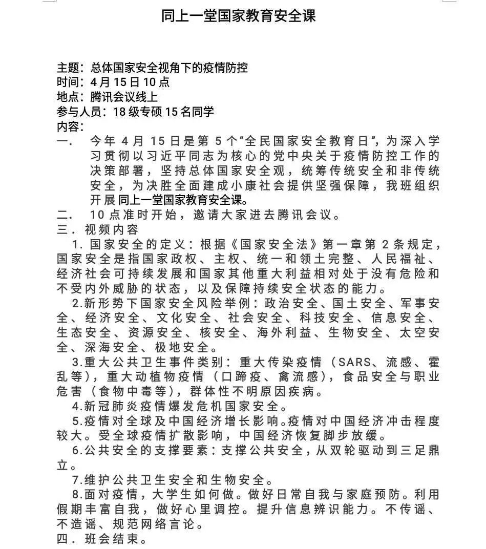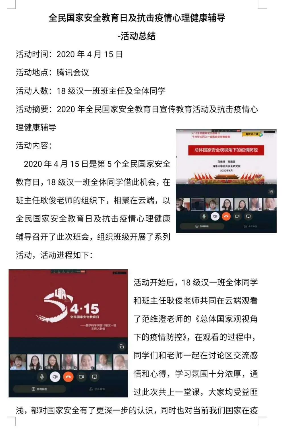 全民国家安全教育日(National Security Education Day)是为了增强全民国家安全意识,维护国家安全而设立的节日。为深入学习贯彻以习近平同志为核心的党中央华体会网页版疫情防控工作的决策部署,坚持总体国家安全观,响应国家安全教育,我院各班级围绕“增强国家安全意识”召开主题“云”班会进行学习和交流。