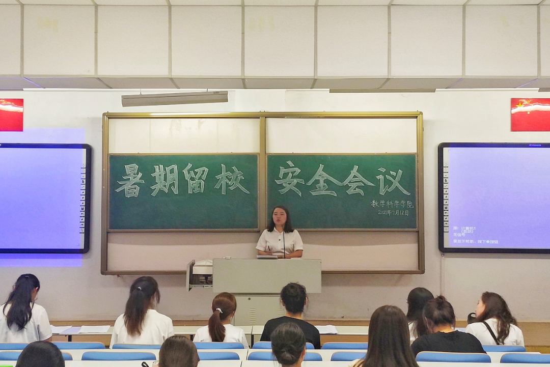 为保障2021年暑期留校住宿学生在校期间正常的学习、生活及其人身财产安全,数学科学学院根据学校安全工作要求,安排值班老师对学生进行管理,及时妥善处置学生可能遇到的问题或突发状况。值班老师按照值班表严格履行值班职责,如遇突发状况或紧急事故将第一时间向带班领导汇报情况,并及时赶往事发现场进行妥善处置。并于7月12日,数学科学学院辅导员刘沙沙老师在行知楼118召开2021年暑期留校安全会议,参会人员为本次暑期全体留校人员。刘老师从有关学生人身、财产安全等安全事项方面做出强调。