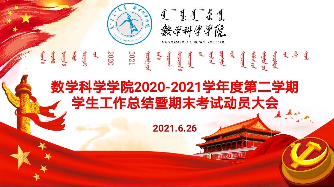 2021年6月26日下午,我院2020-2021学年度第二学期学生工作总结暨期末考试动员大会于学院楼报告厅举行。本次大会由学院团总支书记皮建东老师主持,出席大会的领导和老师有:学院党委书记扎其劳教授,学院党委副书记、副院长季建光老师,学院副院长包霞副教授,学院学生思想政治工作辅导员、20级汉二班班主任刘勇波老师,20级蒙班班主任娜仁格日乐老师,20级汉一班班主任刘常彪老师。