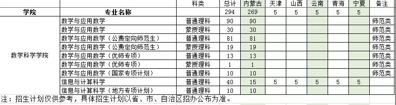 目前,数学科学学院设有数学与应用数学、信息与计算科学和统计学三个本科专业,年招收本科生300余人,其中数学与应用数学专业是国家级一流本科专业建设点, 数学与应用数学专业和信息与计算科学专业都是内蒙古自治区品牌专业。学院从1978年开始招收硕士研究生,1993年获得应用数学硕士学位授权,2004年被评为内蒙古自治区重点学科,2010年获得数学一级学科硕士学位授权,每年招收硕士研究生40余人。依托本学科所建的数学与应用数学专业2019年获得首批国家一流专业建设点。2020年数学与应用数学专业顺利通过教育部师范专业(中学教育)二级认证。经过几代数学人的艰苦创业、不懈努力,学院整体上形成了“严谨、务实、团结、奋进”的优良院风和“教学是立院之本,科研是强院之路”的办学理念。