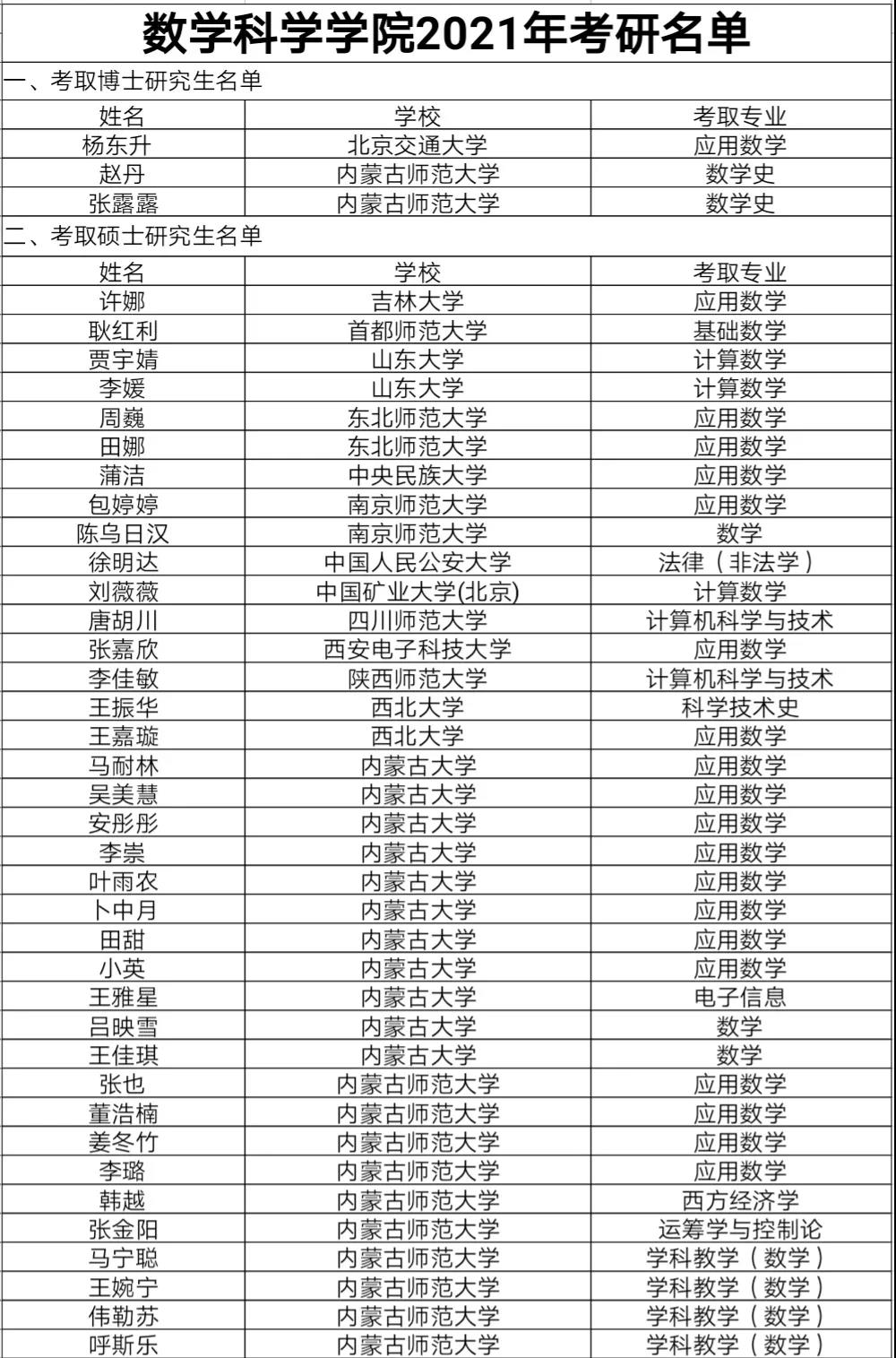 2021年,内蒙古师范大学数学科学学院成功考上博士研究生3人;硕士研究生37人,其中硕士研究生上国家分数线28人,上少数民族分数线1人,保研人数8人。