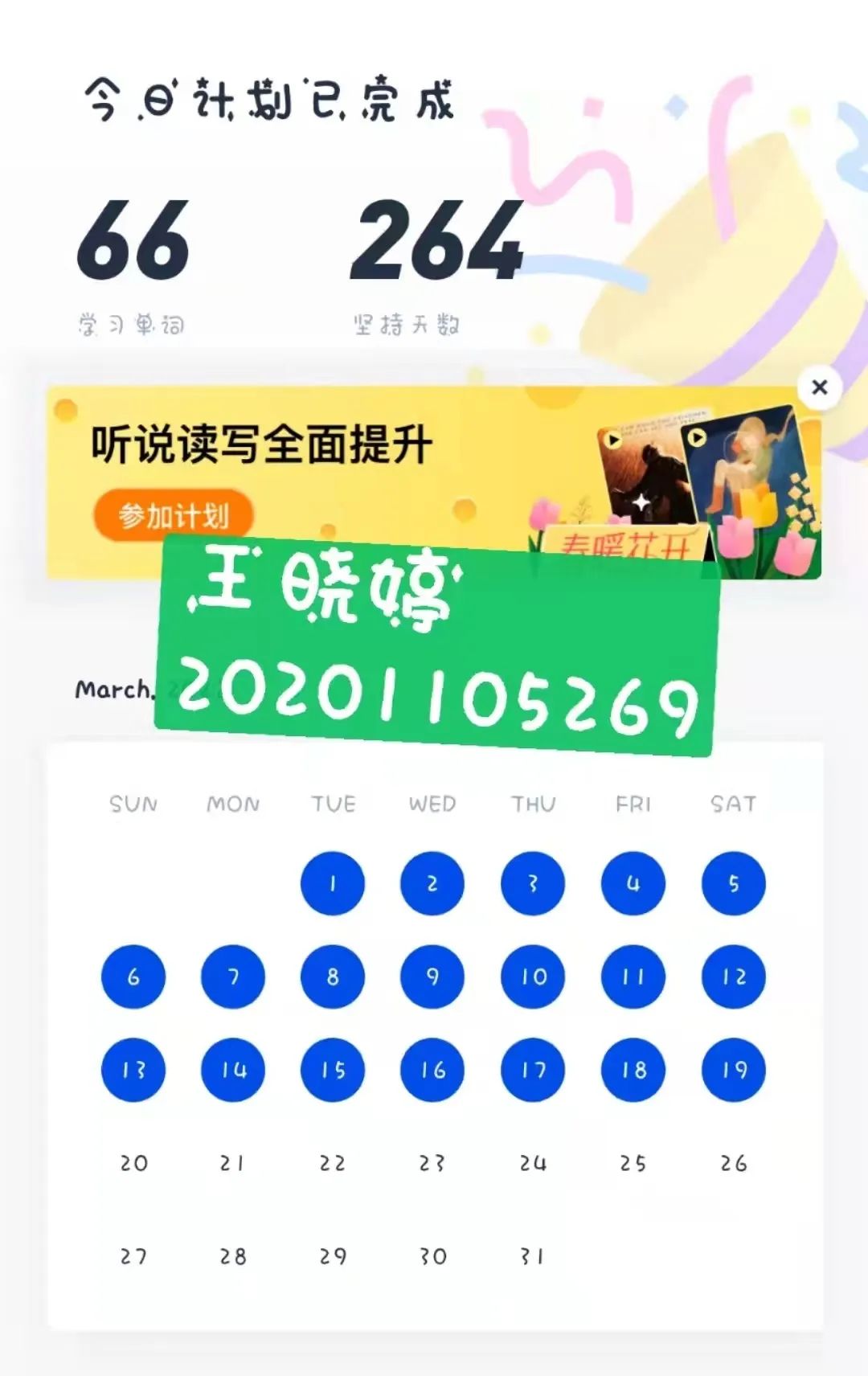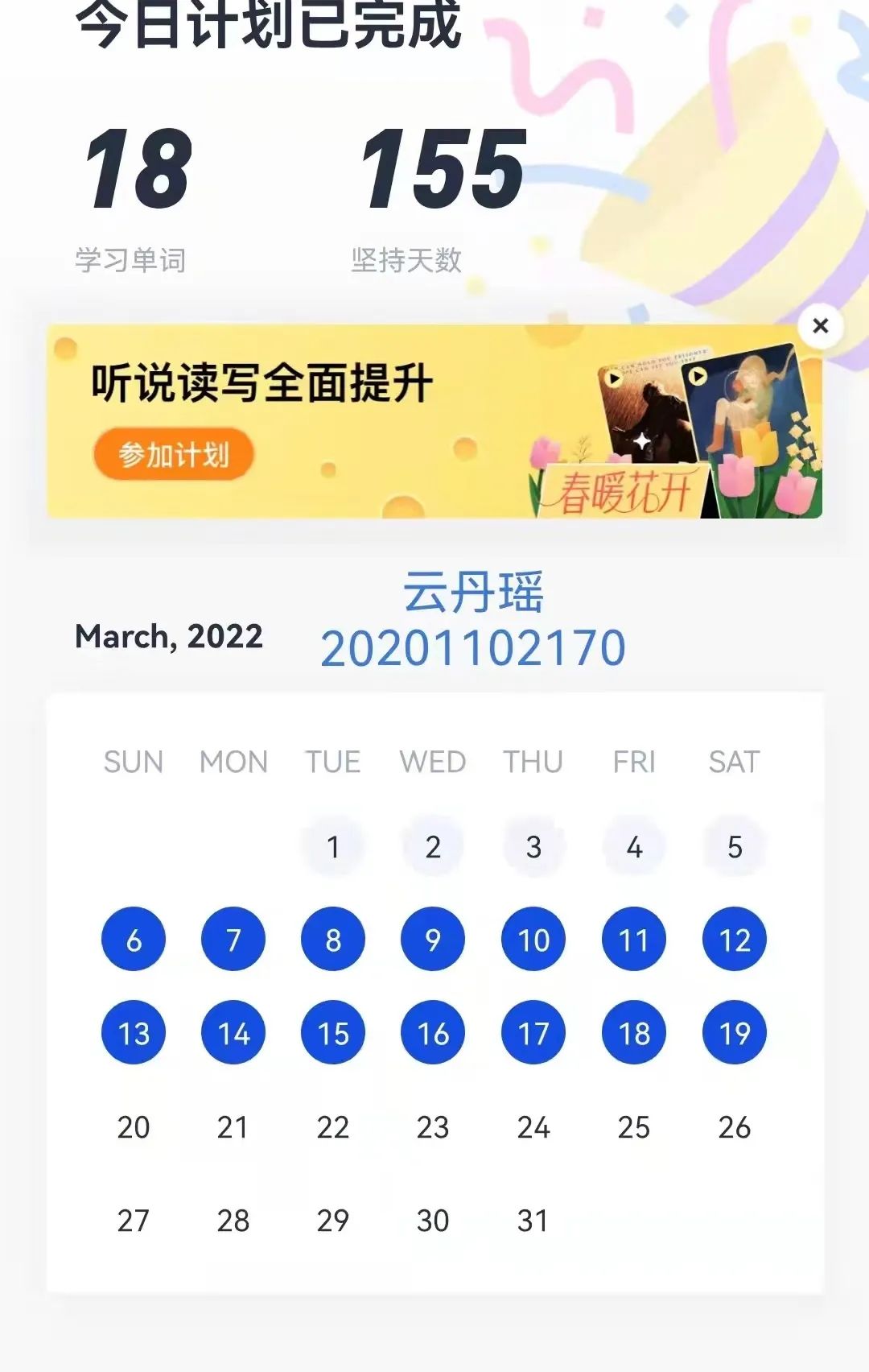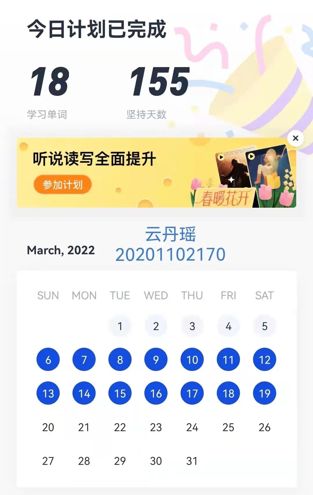 为了丰富学生的居家学习生活,提高学生的学习自觉性,数学科学学院开展了“学习解疫,提升有我”的英语单词打卡活动,150名学生积极响应活动,进行打卡学习。