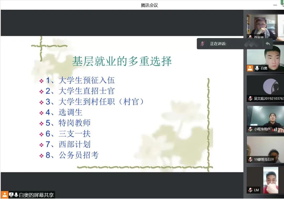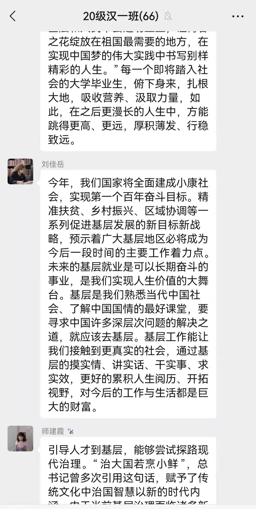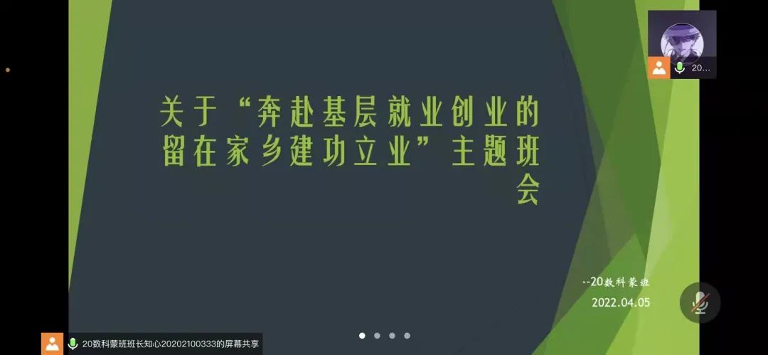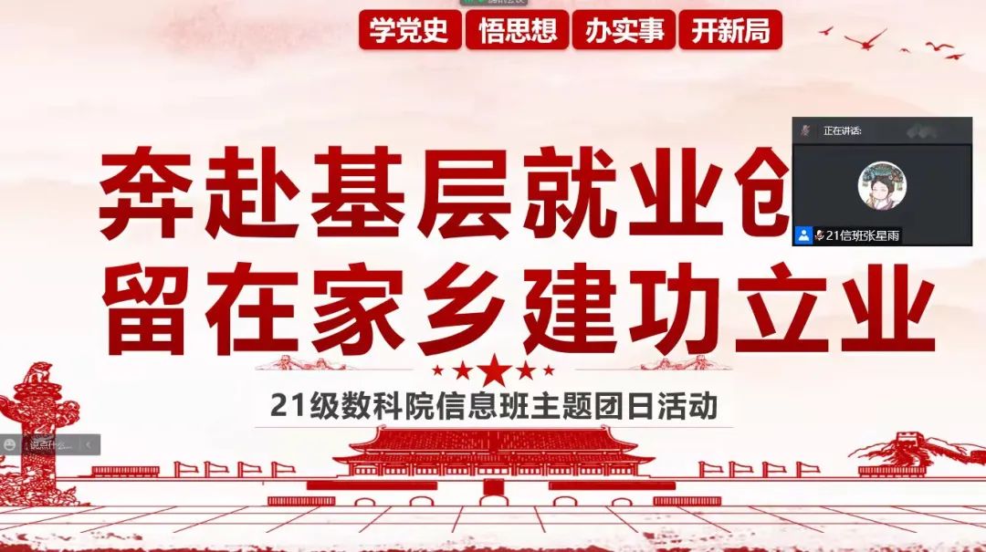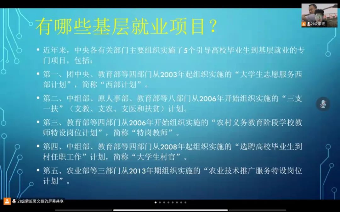 国家近几年出台了一系列优惠政策鼓励高校毕业生积极参加社会主义新农村建设、城市社区建设。为进一步让同学们了解基层就业,数学科学学院各班级开展“奔赴基层就业创业,留在家乡建功立业”线上主题班会,针对基层就业的项目类型,优惠政策等内容进行学习,在充分理解基层就业扶持政策的基础上引导各班同学们加入基层就业。