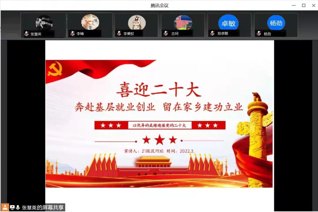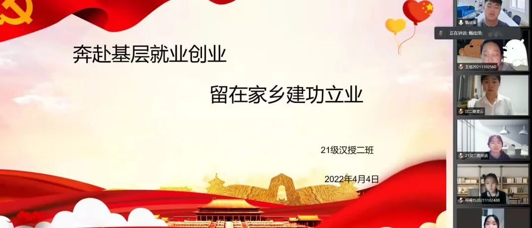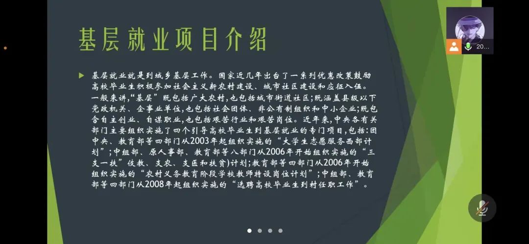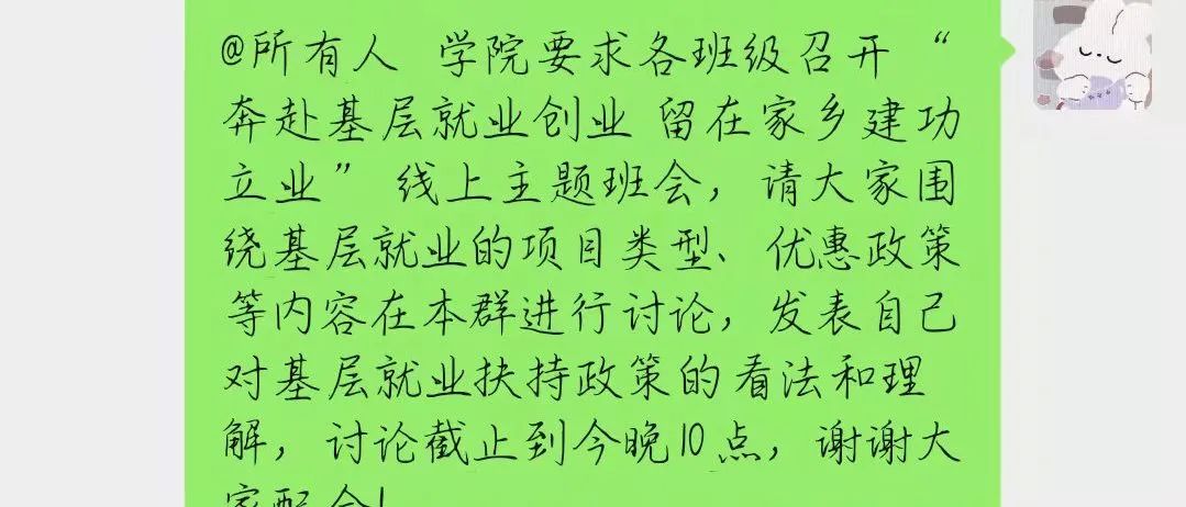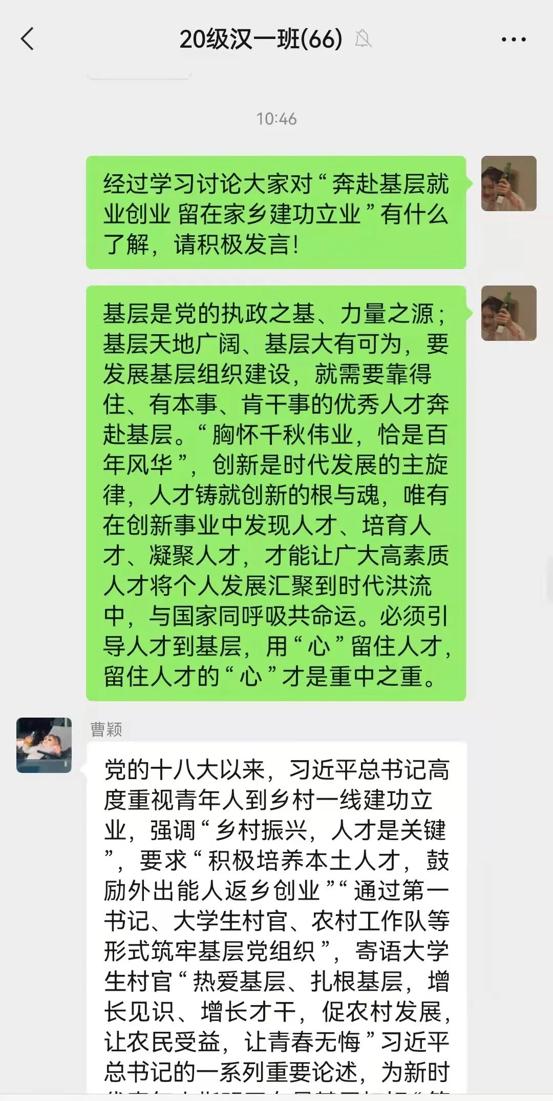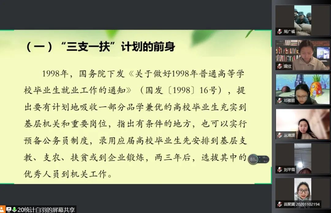 国家近几年出台了一系列优惠政策鼓励高校毕业生积极参加社会主义新农村建设、城市社区建设。为进一步让同学们了解基层就业,数学科学学院各班级开展“奔赴基层就业创业,留在家乡建功立业”线上主题班会,针对基层就业的项目类型,优惠政策等内容进行学习,在充分理解基层就业扶持政策的基础上引导各班同学们加入基层就业。