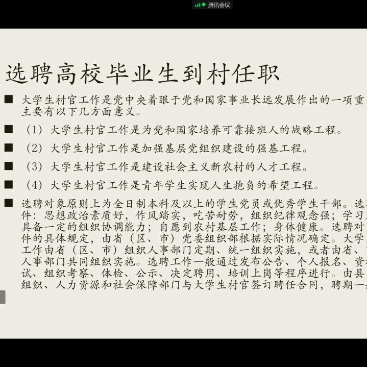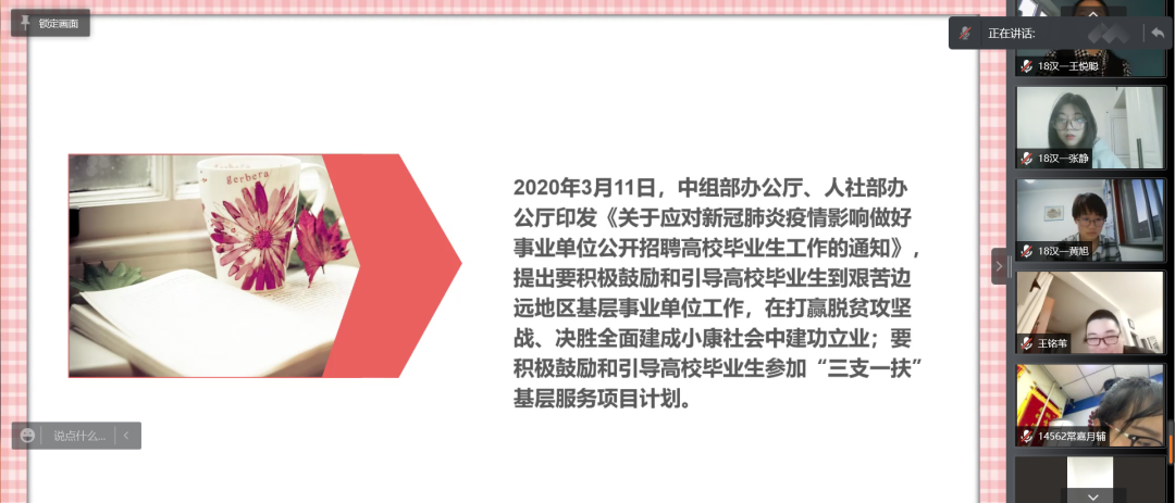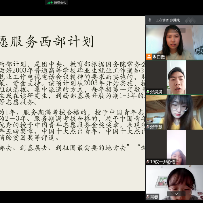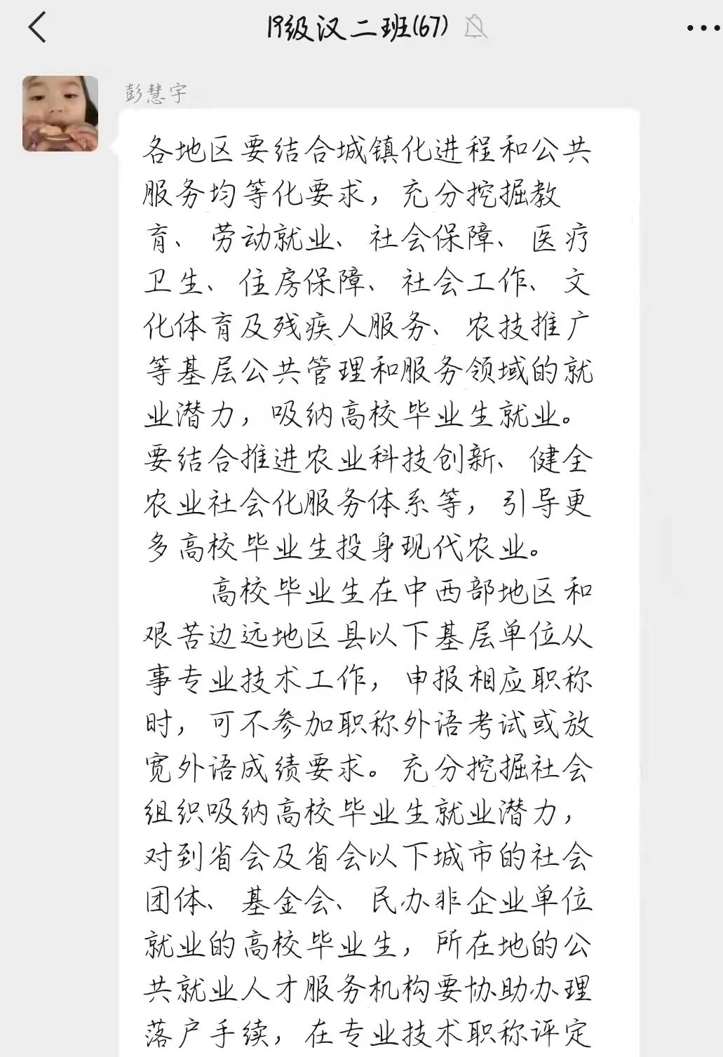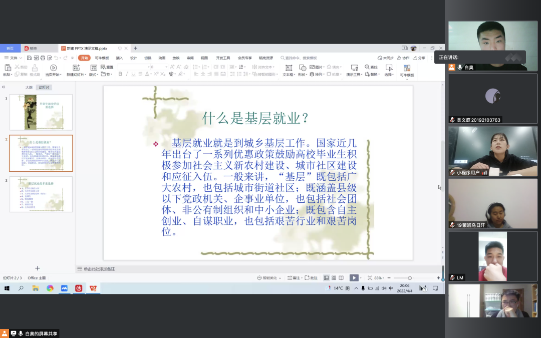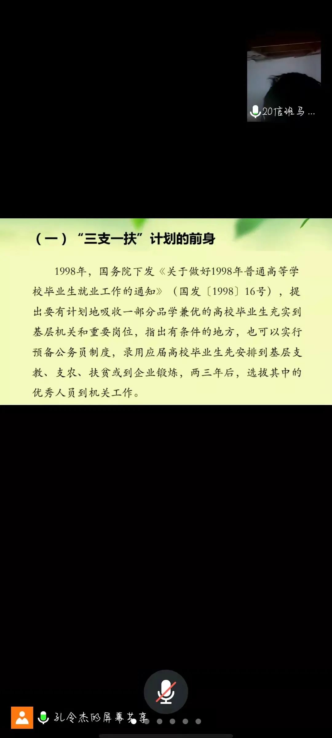 国家近几年出台了一系列优惠政策鼓励高校毕业生积极参加社会主义新农村建设、城市社区建设。为进一步让同学们了解基层就业,数学科学学院各班级开展“奔赴基层就业创业,留在家乡建功立业”线上主题班会,针对基层就业的项目类型,优惠政策等内容进行学习,在充分理解基层就业扶持政策的基础上引导各班同学们加入基层就业。