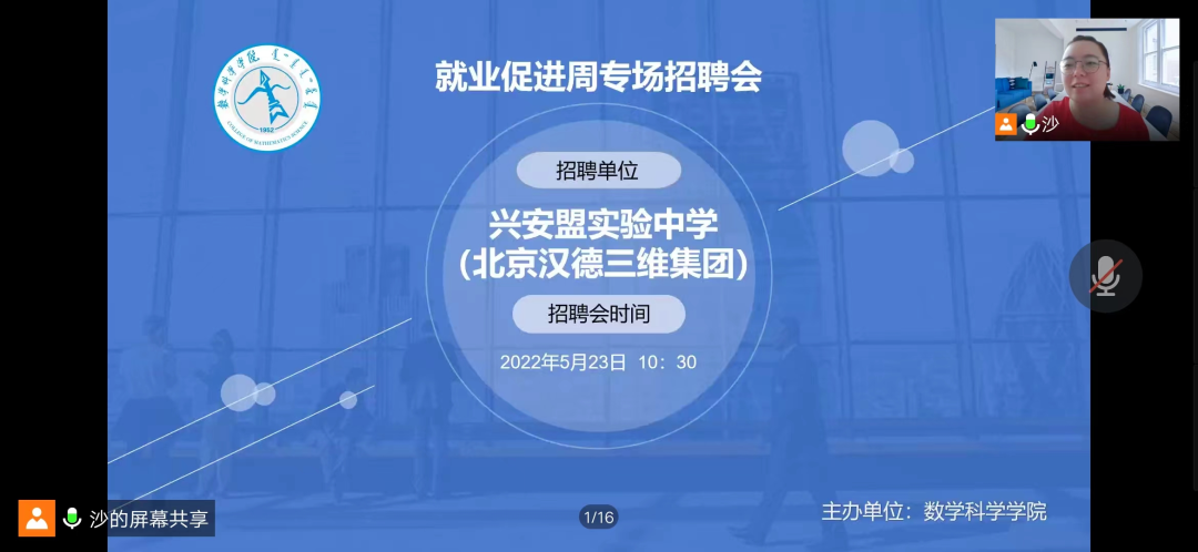 为更好的推进《内蒙古师范大学2022届毕业生就业促进周系列活动方案》的工作要求,全力促进毕业生尽早就业、顺利择业,5月23日上午10:30,学院举办了“就业促进周”网络专场招聘会,此次招聘专场是兴安盟实验中学,实验中学校长解杰、副校长李郭瑞、吴老师以及学院党委副书记、副院长季建光、学生工作与就业办公室副主任刘沙沙、辅导员萨如拉出席此次招聘会议,我院2022届数学与应用数学专业的60多名毕业生参加本次招聘会。