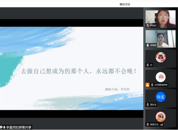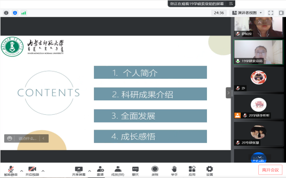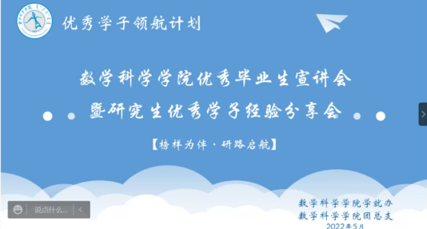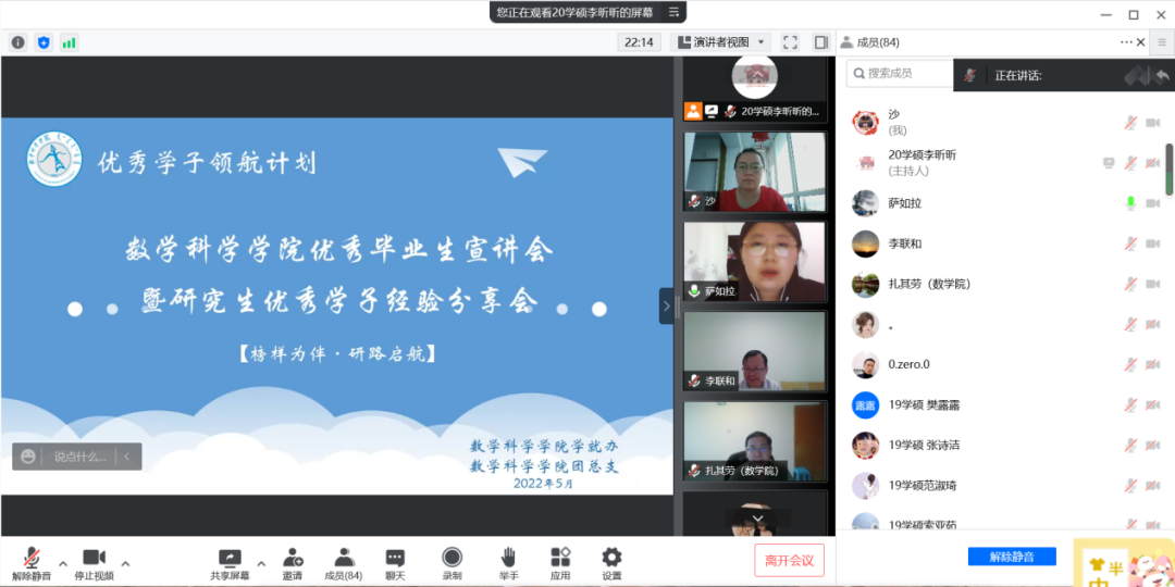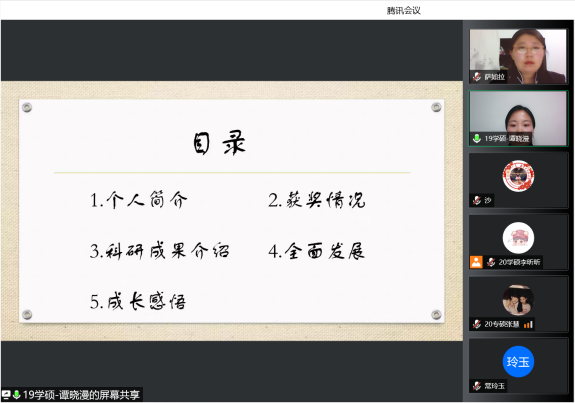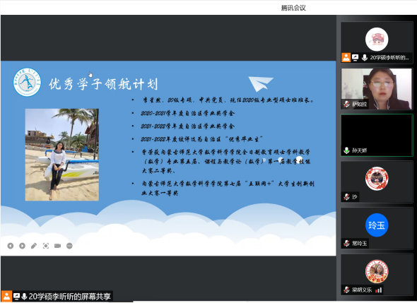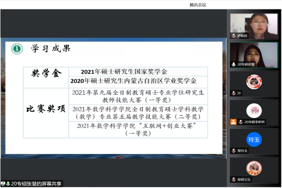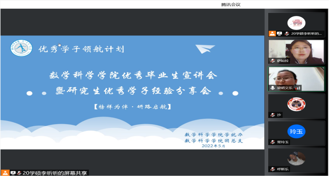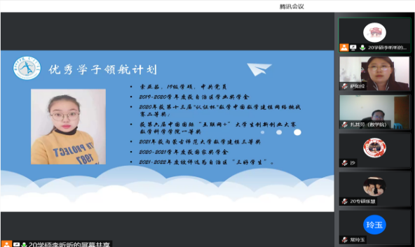 为了充分发挥研究生优秀学子的示范引领作用,更好地落实《内蒙古师范大学华体会网页版开展“榜样为伴·研路启航”研究生国家奖学金获得者事迹宣传活动的通知》《内蒙古自治区教育厅华体会网页版报送2022年春季学期研究生教育教学典型案例的通知》《华体会网页版组织开展内蒙古师范大学“学生劳动教育宣传月”活动的通知》等文件要求,我院于5月23日晚,组织全体研究生开展“数学科学学院优秀毕业生宣讲会暨研究生优秀学子经验分享会”,邀请我院2021年度国家奖学金获得者索亚茹、张慧,2021年度自治区奖学金获得者孙天娇、谭晓漫,2021-2022年度自治区“优秀毕业生”李星然、“三好学生”索亚茹,共5名优秀学子为大家分享自己学习生涯中的经验和感悟。