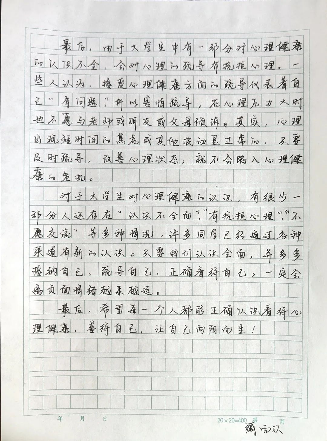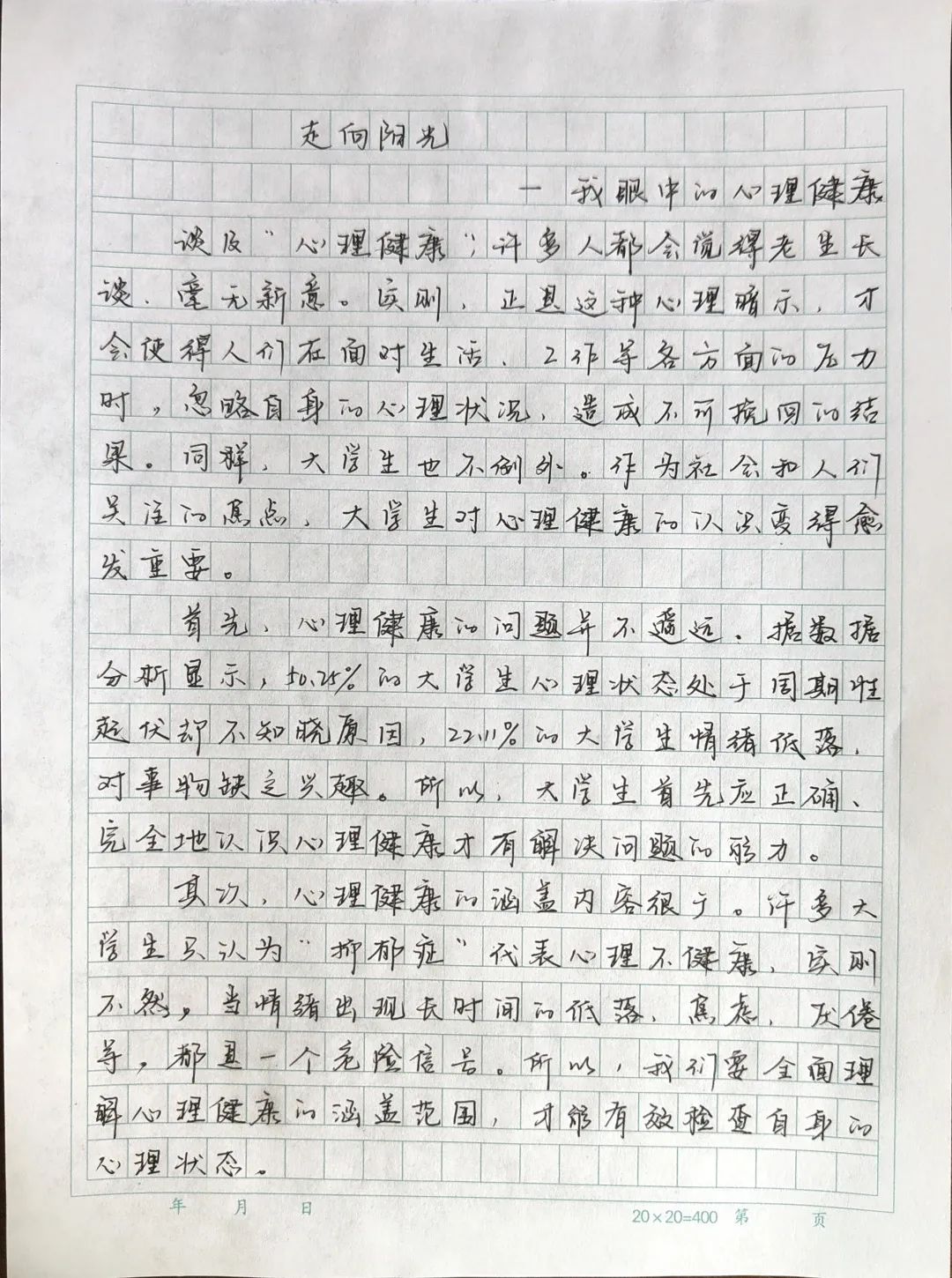 通过此次心理健康征文活动,激发了大学生关注心灵,积极营造利于大学生身心健康、和谐发展的氛围,引导学生正确认识自我,为心理健康敞开心门,起到了良好的教育意义。