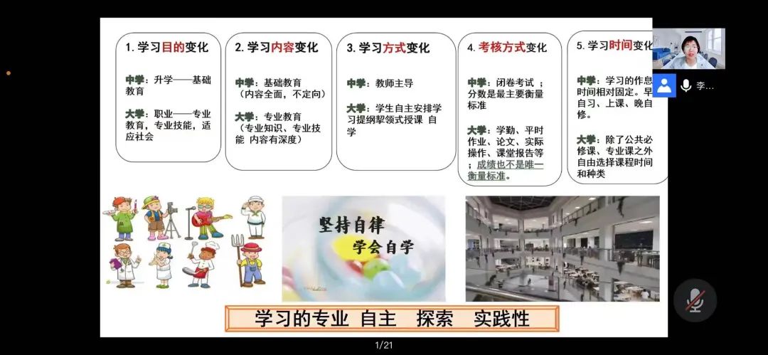 李翠云老师将讲座分成了三部分,围绕大学生自我认知,新环境的改变,疫情防控安全等方面对学生们进行了讲解。