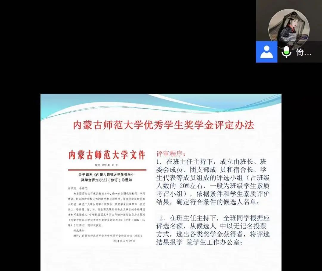 其次,季建光老师为新生全方面解读了内蒙古师范大学素质评价方法、学生学业成绩计算方法、身体素质评价、日常表现测评及各类奖助学金评定方法等学校资助政策。