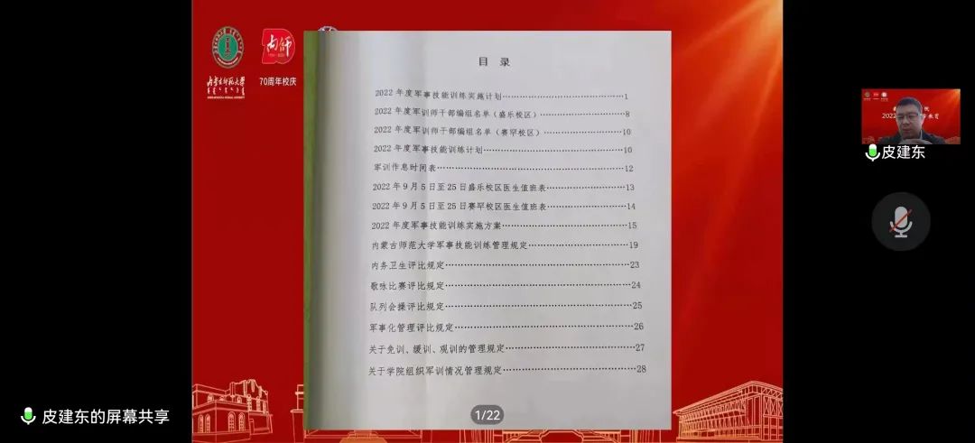 9月6日上午7:30,数学科学学院于线上举办2022年度学生军事技能训练动员大会。学院学生思想政治工作辅导员刘沙沙老师主持此次会议,数学科学学院党委副书记、副院长季建光老师、学院团总支书记皮建东老师参加此次会议。
