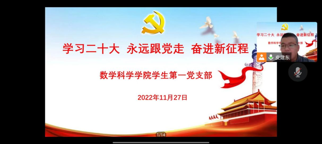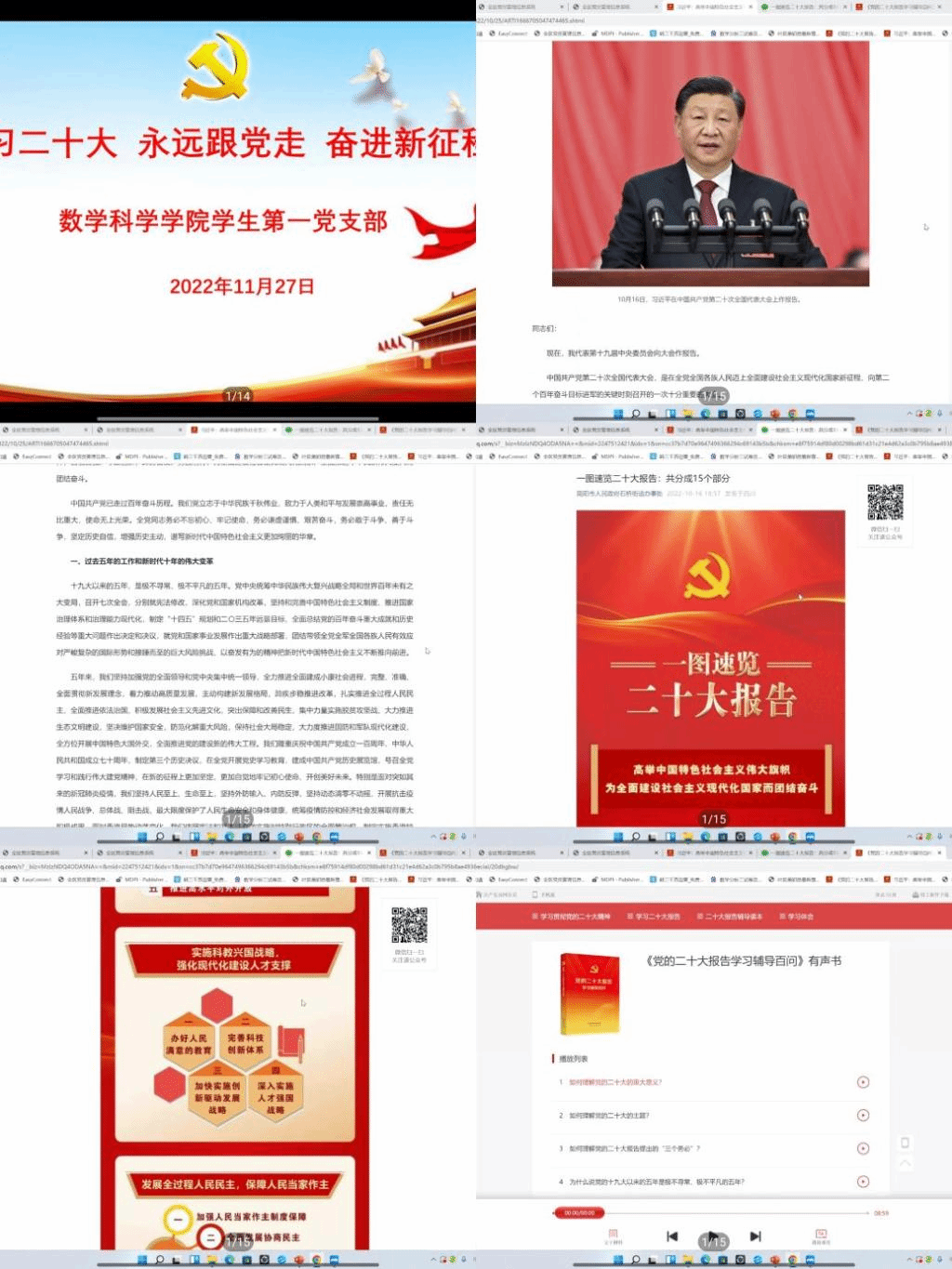 为深入学习宣传贯彻党的二十大精神,引导广大党员青年自觉把智慧和力量凝聚到党的二十大确定的各项目标任务上来,更好团结引领广大党员青年紧跟党奋进新征程、夺取新胜利,数学科学学院学生第一党支部、学生第二党支部及研究生党支部于2022年11月27日晚开展“学习领会二十大精神”主题活动。