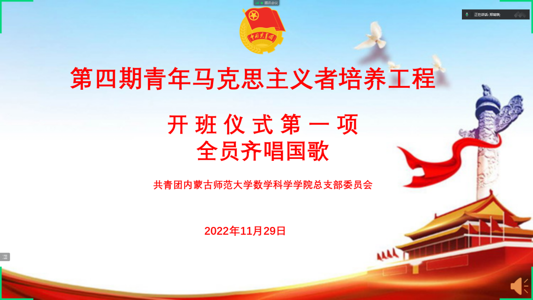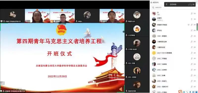 开班仪式由数学科学学院团总支书记皮建东老师主持,党委副书记、副院长季建光老师,学院学就办副主任刘沙沙老师,学院辅导员萨如拉老师出席,多名志愿者服务队干部和优秀团员作为青马班学员参加,第四期青马班为期两周的学习自此开始。
