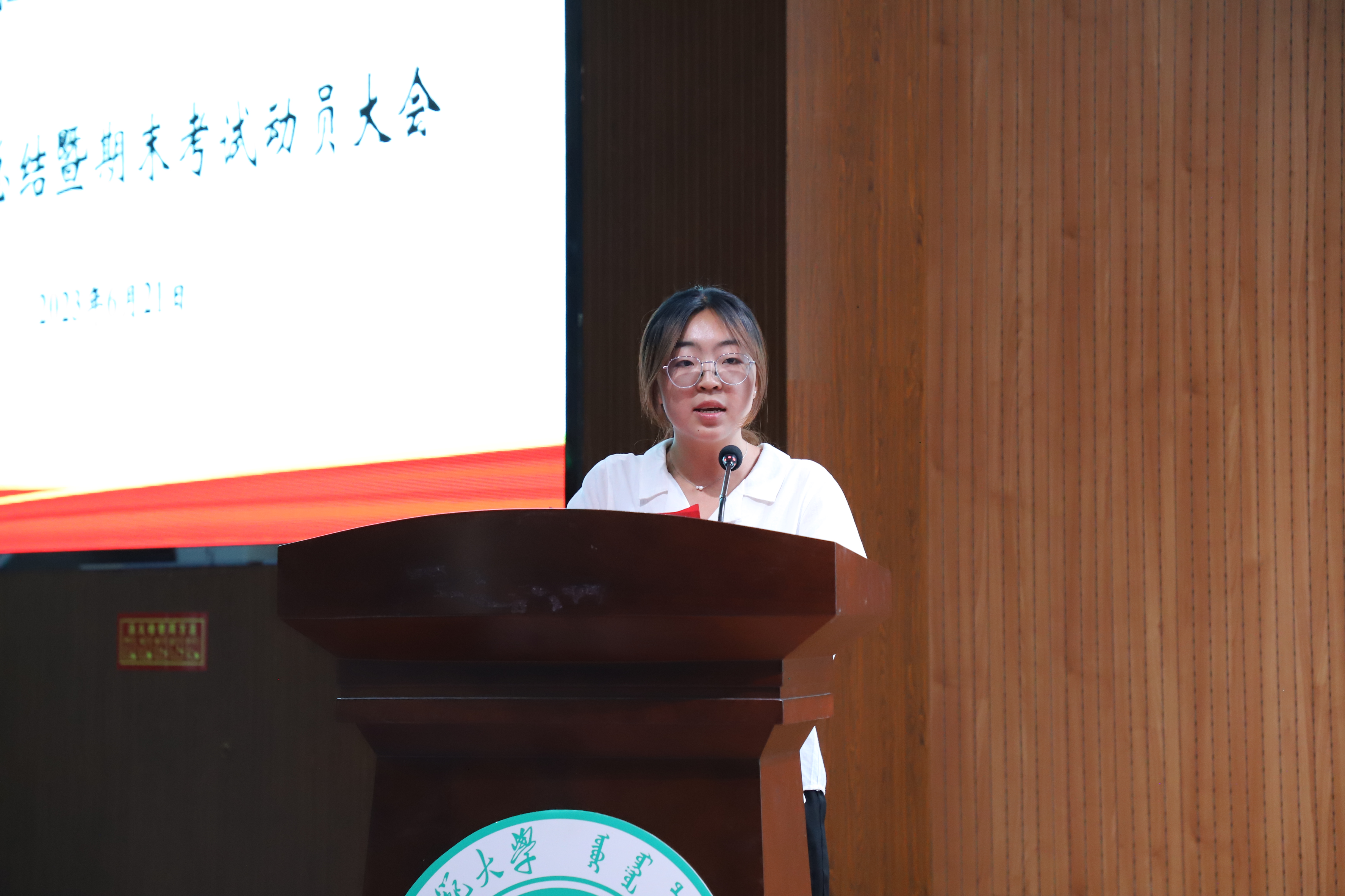 2023年6月21日晚七点,数学科学学院于图书馆二楼报告厅举行了我院2022—2023学年第二学期学生工作总结暨期末考试动员大会。出席本次会议的有学院院长扎其劳教授,学院党委副书记、副院长季建光老师,学院副院长包霞老师,团总支书记皮建东老师,学生工作辅导员萨如拉老师,学生工作辅导员阿茹罕老师,21级汉一班班主任李春兰老师,21级蒙班班主任乌日柴胡老师,21级汉四班班主任高兴华老师,21级信息班班主任赵学慧老师,22级一班班主任李璐老师,22级二班班主任郑佳璇老师,22级三班班主任苏日古嘎老师,22级四班班主任朱建波老师,22级五班班主任莘智老师,本次会议由学生工作与就业办公室副主任刘沙沙老师主持。