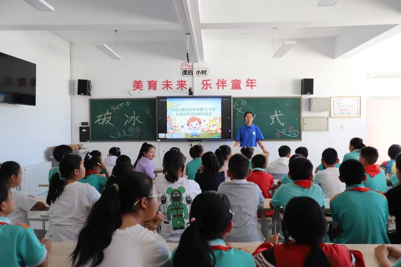 7月17日上午,阳光明媚,数学院暑期“三下乡”社会实践教育关爱服务团在盛乐镇公喇嘛小学举办了破冰仪式。在夏日炎炎的热烈氛围中,志愿者团队及公喇嘛小学学生齐聚一堂,在欢声笑语中进行自我介绍和游戏互动环节,并为孩子们送上了精心准备的纪念品,拉开了社会实践活动的帷幕,也为教育关爱服务团与乡村孩子之间建立了友谊和信任。