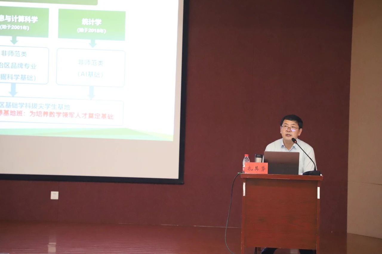 数学科学学院院长扎其劳老师从铸牢中华民族共同体意识的由来、意义以及我国民族基本政策等五个方面强调了铸牢中华民族共同体意识的重要性,激励同学们努力成为有理想、敢担当、能吃苦、肯奋斗的新时代好青年。同时,扎其劳院长还向同学们介绍了学院的发展概况、师资队伍、科学研究、一流学科、人才培养、党建与学生工作、优质平台建设等方面的情况。