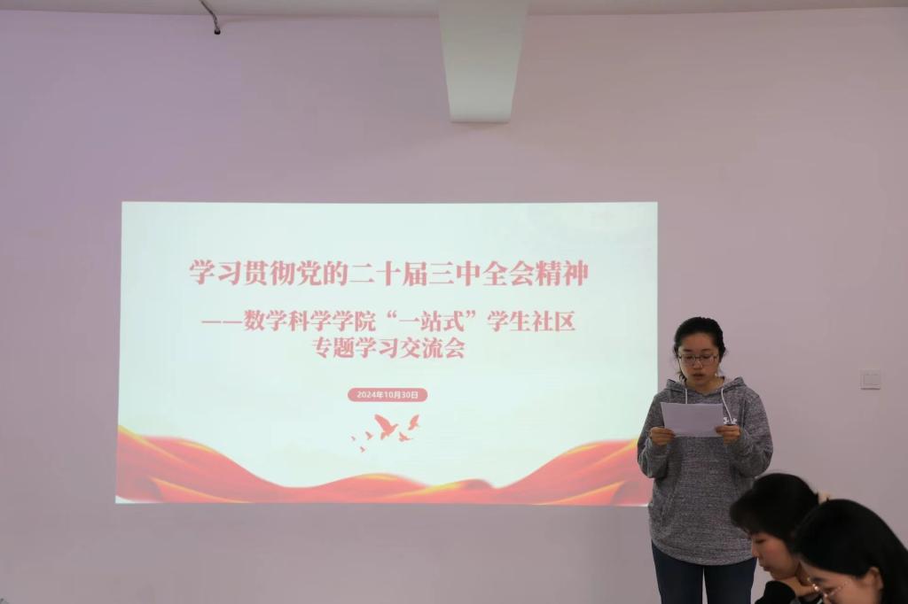 为深入学习贯彻党的二十届三中全会精神,进一步提升我院学生的理论素养,10月30日,数学科学学院学生党支部在盛乐校区学生公寓13号楼“一站式”学生社区召开专题理论学习研讨会。本次会议由刘沙沙老师、阿茹罕老师、萨如拉老师主持,学院学生党员代表参加。