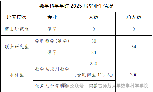 内蒙古师范大学数学科学学院前身数理科与内蒙古师范大学同龄,始建于1952年,是新中国成立后党和国家在边疆民族地区最早设立的数理科之一。学院现有数学与应用数学、信息与计算科学和统计学三个本科专业,前两个专业均为自治区品牌专业,其中数学与应用数学专业是师范类专业。2019年获首批国家级一流本科专业建设点(数学与应用数学)和教育部党建工作样板党支部。2020年通过普通高等学校师范类专业二级认证。2022年获批自治区级一流本科专业建设点(信息与计算科学)。2022年“思政引领+实践创新+平台支撑的数学一流专业建设探索与实践”获得自治区高等教育教学成果奖一等奖。2023年专业核心课程《数学分析》被评为国家级一流课程。
