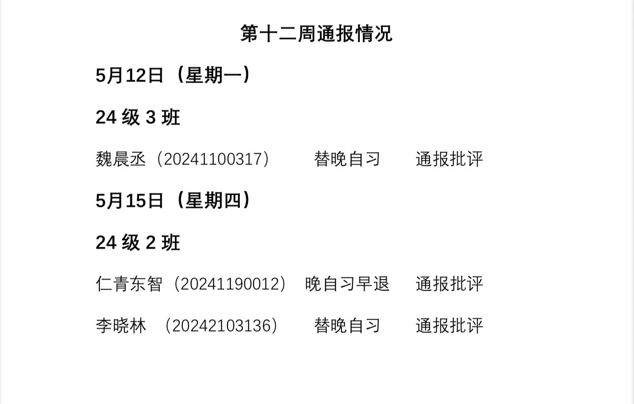 数学科学学院2024——2025年度第二学期第十二周通报情况