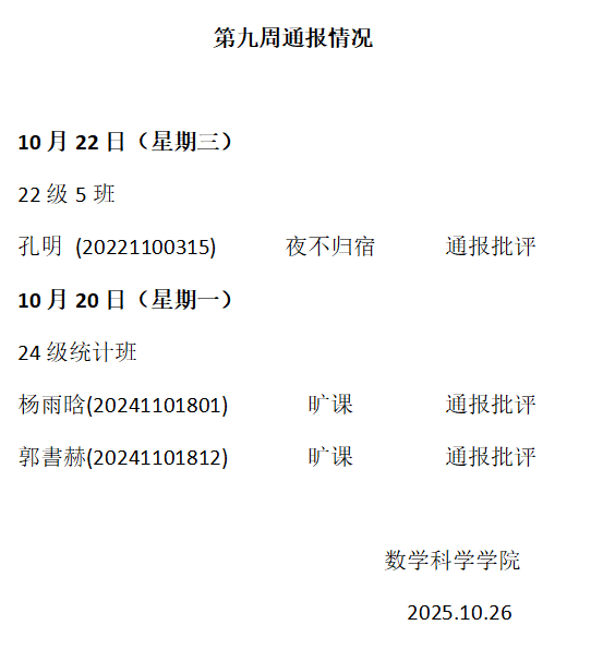 数学科学学院2025——2026年度第一学期第九周通报情况