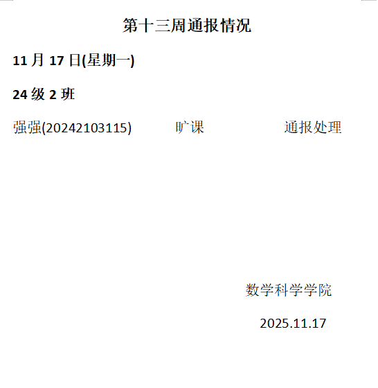 数学科学学院2025——2026年度第一学期第十三周通报情况
