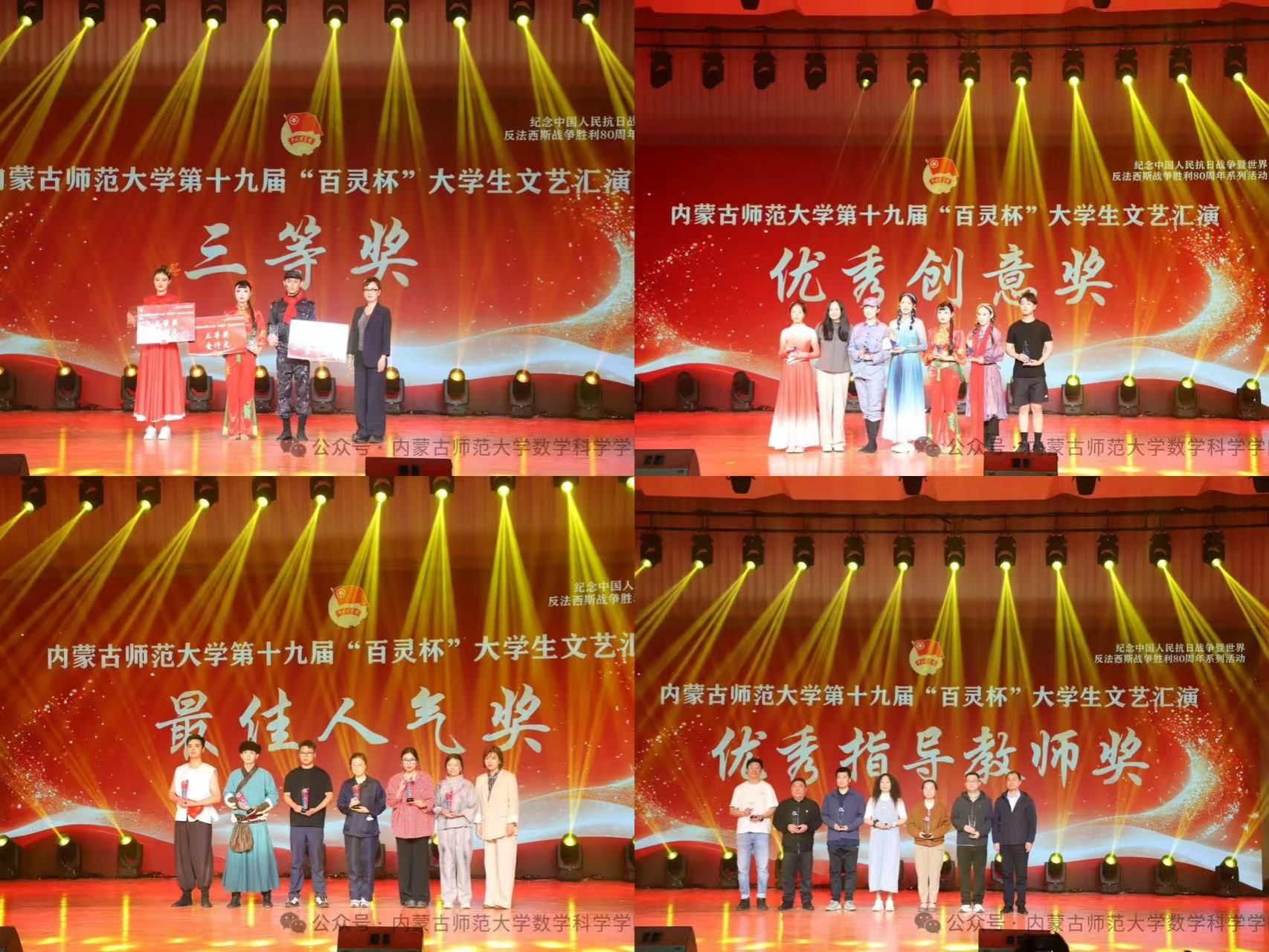 5 月 11 日,内蒙古师范大学纪念中国人民抗日战争暨世界反法西斯战争胜利80周年系列活动——内蒙古师范大学第十九届“百灵杯”大学生文艺汇演在盛乐校区音乐厅隆重举行。数学科学学院选送的舞蹈作品《九儿》凭借精湛的表演和深刻的情感表达惊艳全场,最终斩获三等奖、最佳人气奖及优秀创意奖三项殊荣,学院的指导教师也荣获优秀指导教师奖!