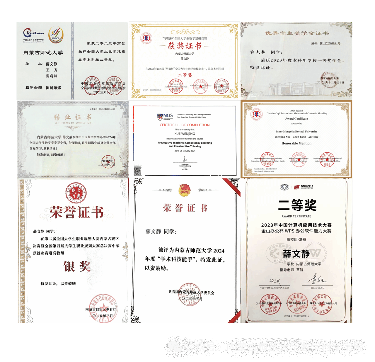 薛文静同学在校期间品学兼优,以交换生身份在北京“双一流”院校首都师范大学交流学习一年,并入选“卓越师范生拔尖培养计划”,以国家公派短期留学生身份到新加坡国立大学(NUS)学习。先后荣获2023年"高教社杯"全国大学生数学建模竞赛全国二等奖、2024年"华数杯"国际赛H奖(国际二等奖)、2024年全国大学生数学竞赛省级一等奖。她还利用课余时间积极参加校内外实践活动,担任大学生支教志愿者,与中小学生共同完成了“一起云课堂”等活动,赴和林格尔百什户学校支教,去首都师范大学附属回龙观育新学校进行教育实习。此外还先后担任内蒙古师范大学辩论社辩手,数学科学学院学工助理等工作。
