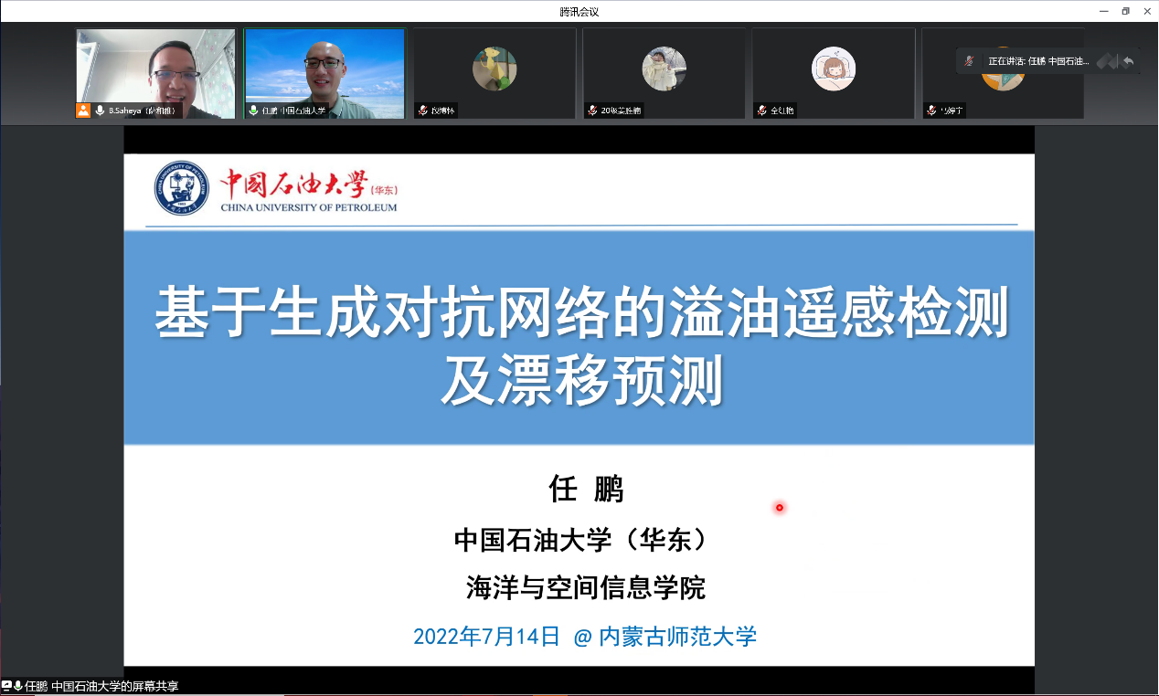 2022年7月14日上午8:30-10:00,数学科学学院以线上会议的形式举办了迎校庆70周年暨内蒙古自治区应用数学中心系列讲座。特邀请中国石油大学(华东)教授,博士生导师,青岛市“海洋灾害预防检测信息国际联合研究中心”主任任鹏作了题目为“基于生成对抗网络的溢油遥感检测及漂移预测研究”的报告。本次讲座由高性能计算中心主任萨和雅主持,相关方向的教师、研究生和本科生听了本次报告。