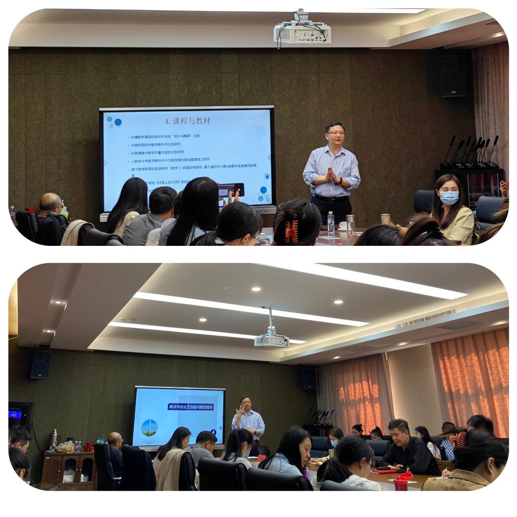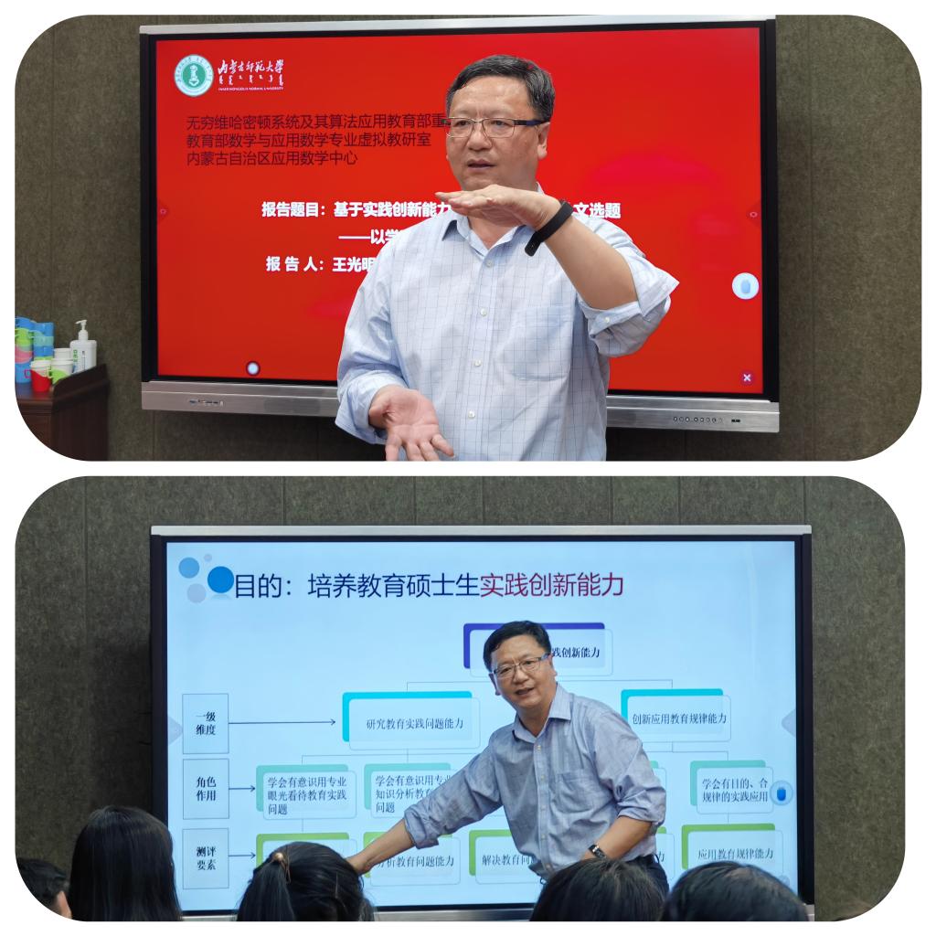 5月3日下午,我院举办教师教育名家系列学术讲座,邀请到国务院学位委员会全国教育专业教育指导委员会委员、教育部高等学校(教育学类)专业教学指导委员会委员、教育部高等学校中学教师培养教学指导委员会委员、教育部普通高等学校师范类专业认证专家委员会学术委员会委员、教育部基础教育教学指导委员会数学专委会委员、《数学教育学报》和《中等数学》主编、天津师范大学教育学部部长、博士生导师王光明教授作了题为“基于实践创新能力的教育硕士学位论文选题—以学科教学(数学)为例”的学术讲座。讲座由我院李春兰教授主持。相关专业的教师、研究生和本科生聆听了讲座。