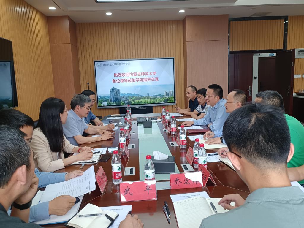 5月16日下午,考察团到重庆师范大学数学科学学院调研交流。重庆师范大学数学科学学院党委书记杨江水、院长杨志春以及学院的相关负责同志进行座谈交流。会上,重庆师范大学数学科学学院党委书记杨江水和内蒙古师范大学数学科学学院院长扎其劳分别从学科建设、师资队伍建设、卓越人才培养及社会服务等方面进行了详细的介绍。此外,针对学科发展所面临的问题,双方就两院的合作前景作了进一步探讨。