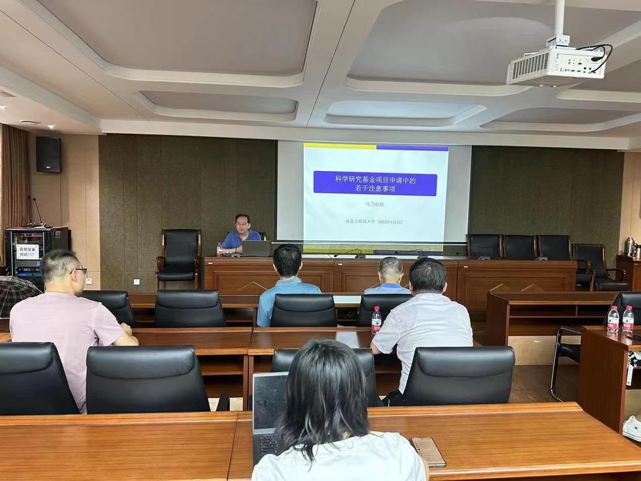 7月3日下午,应数学科学学院邀请汕头大学教授、内蒙古师范大学特聘教授乌兰哈斯先生作题目为“科学研究基金项目申请中的若干注意事项”的学术讲座。出席本次讲座的有刘官厅教授、扎其劳院长、包霞副院长以及我院部分教师。