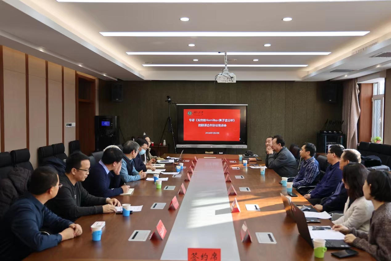 1月22日,无穷维哈密顿系统及其算法应用教育部重点实验室建设的重要成果之一、重点实验室主任阿拉坦仓教授的专著《无穷维Hamilton算子谱分析》的翻译合作推进会在赛罕校区文史楼二号会议室召开。专著作者阿拉坦仓教授和共同作者内蒙古大学数学科学学院吴德玉教授、黄俊杰教授、侯国林教授,以及专著的英文、日文、西里尔文、蒙古文翻译的负责人和学院领导参加了会议。会议由学院副院长包霞主持。