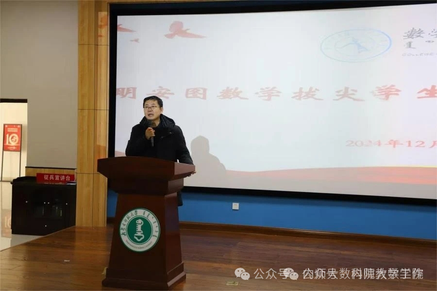 12月15日,数学科学学院在学生事务中心一楼107报告厅开展“明安图数学拔尖学生培养基地”(以下简称明安图数学基地)招生选拔宣讲会。学院党委书记张伟、院长扎其劳出席会议并讲话。2024级数学与应用数学(非定向)、信息与计算科学、统计学三个专业学生与班主任参加会议。会议由学院副院长萨和雅主持。