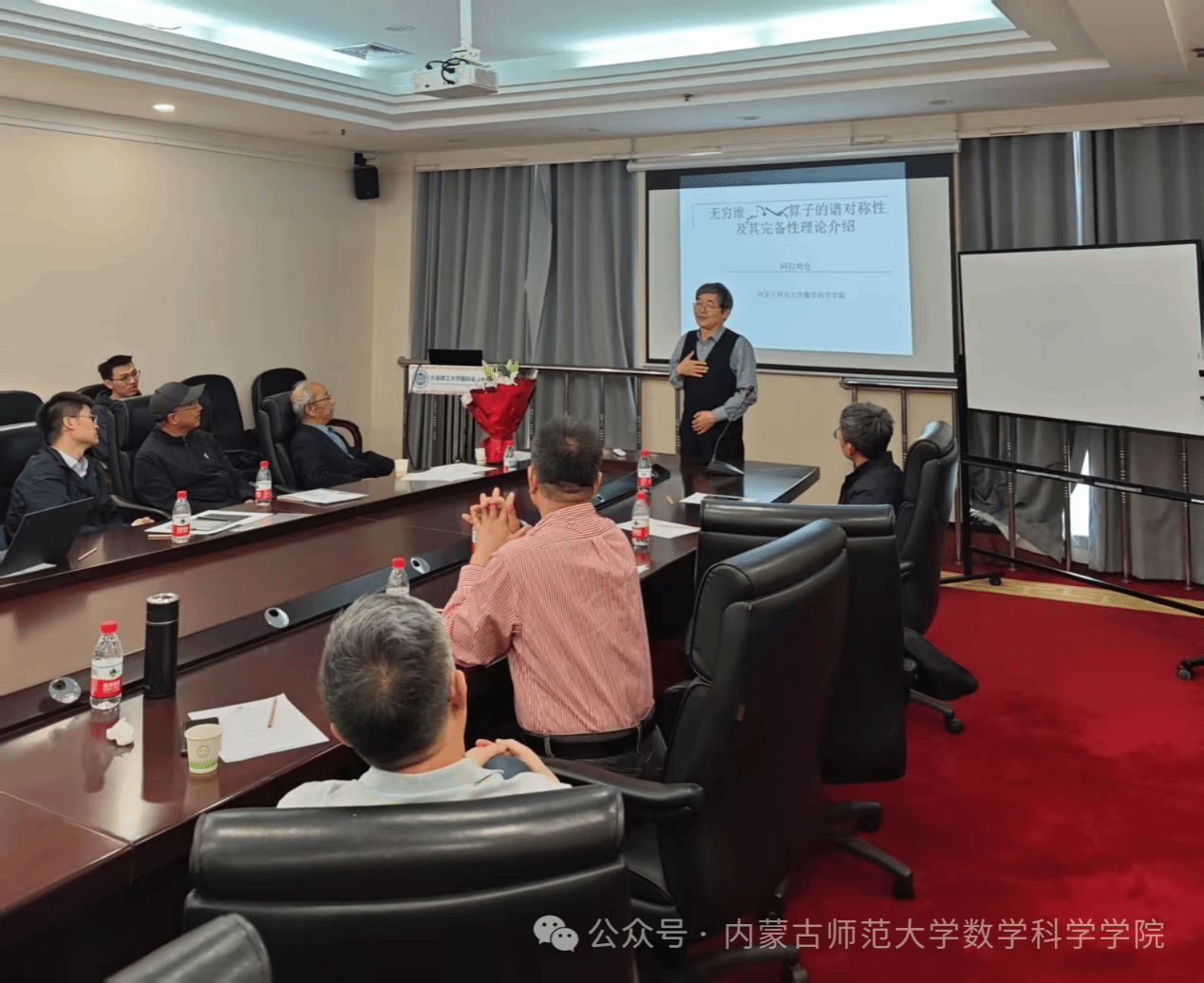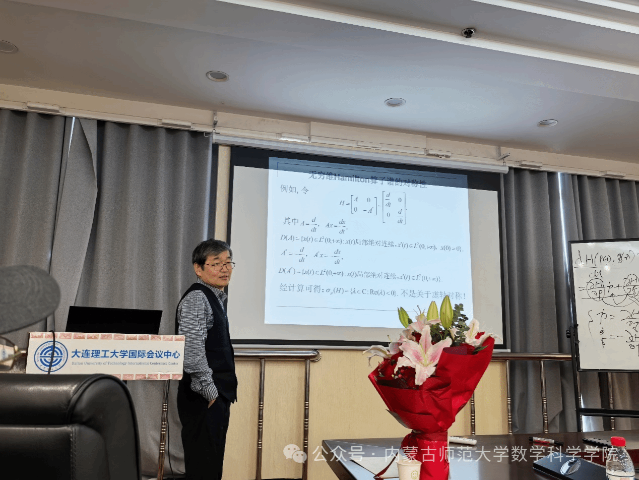 2025年5月16日,无穷维哈密顿系统及其算法应用教育部重点实验室主任阿拉坦仓教授应大连理工大学数学科学学院邀请,在可积系统与数学机械化研讨会上作题为“无穷维Hamilton算子的谱对称及其完备性介绍”的学术报告。