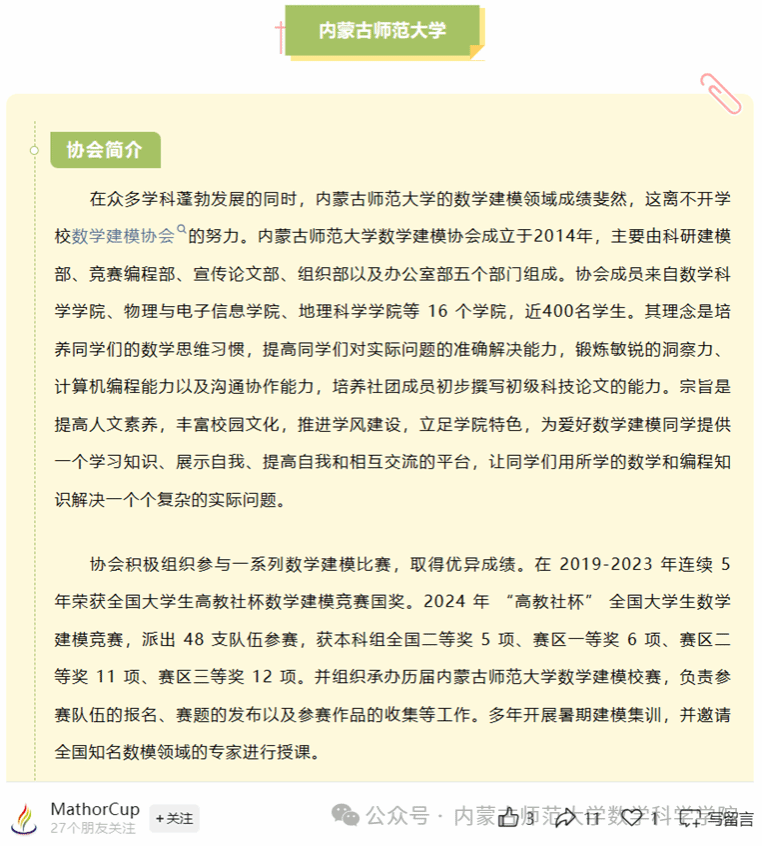 近年来,我校积极推动数学建模与实际应用的深度融合,广泛开展相关教育与教学活动,不断提升学生的数学建模能力,在各类国内竞赛中屡获佳绩。内蒙古师范大学数学科学学院联合数学建模协会首次成为MathorCup数学应用挑战赛的协办单位,并针对比赛进行了专项教学与指导。通过“网络自学—协会指导—导师指正”的多层次学习模式,学生们在浓厚的学术氛围中茁壮成长,最终取得了优异的成绩。