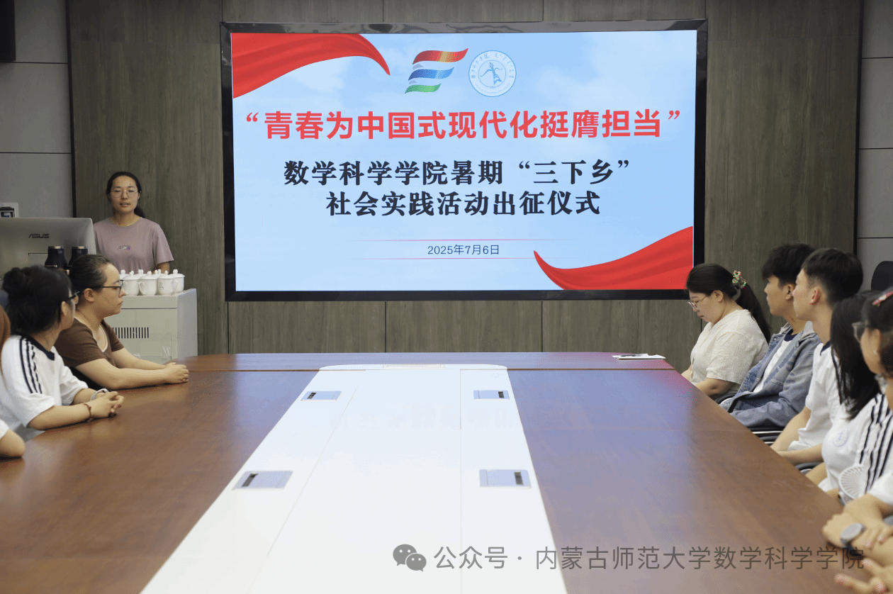 7月6日上午,数学科学学院2025年暑期“三下乡”社会实践活动出征仪式在学院楼会议室举行。团队带队教师刘沙沙、阿茹罕、萨如拉出席仪式,团队16名志愿者参加出征仪式。