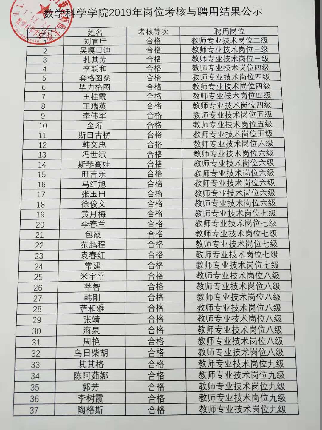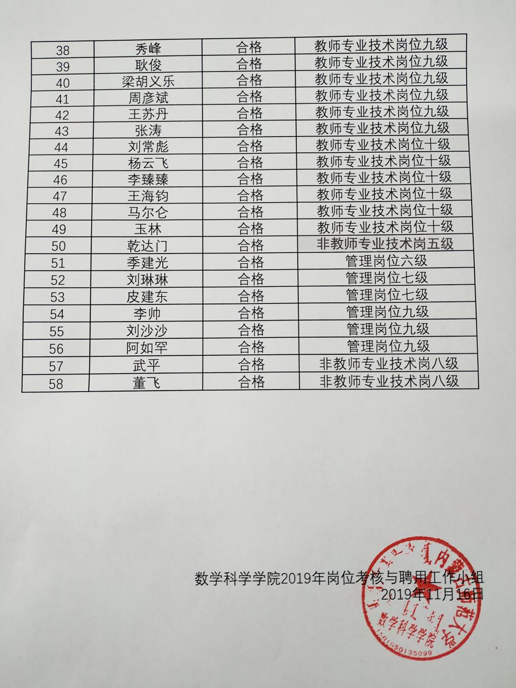 数学科学学院2019年岗位考核与聘用结果公示